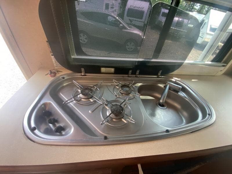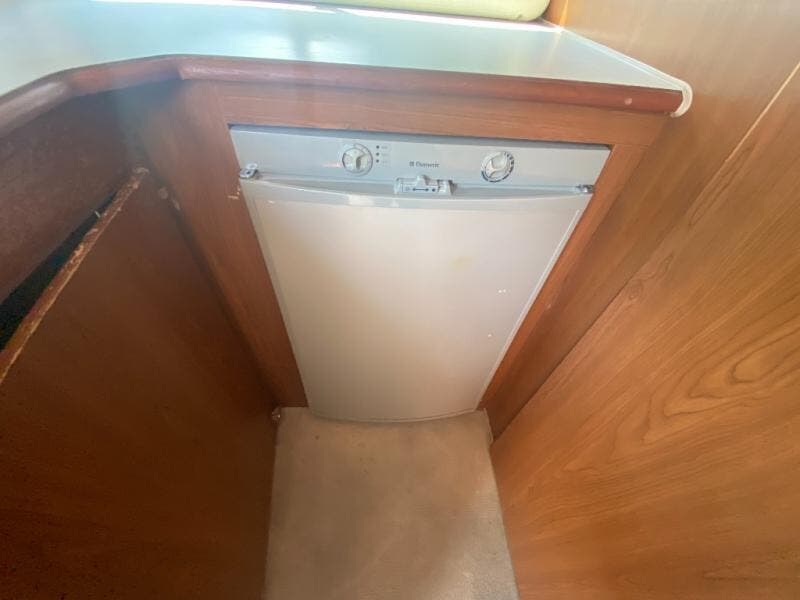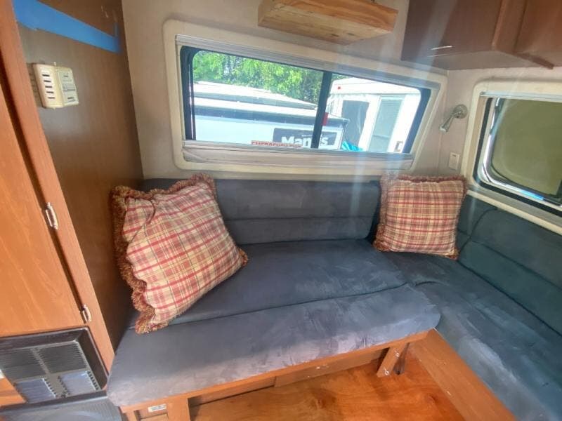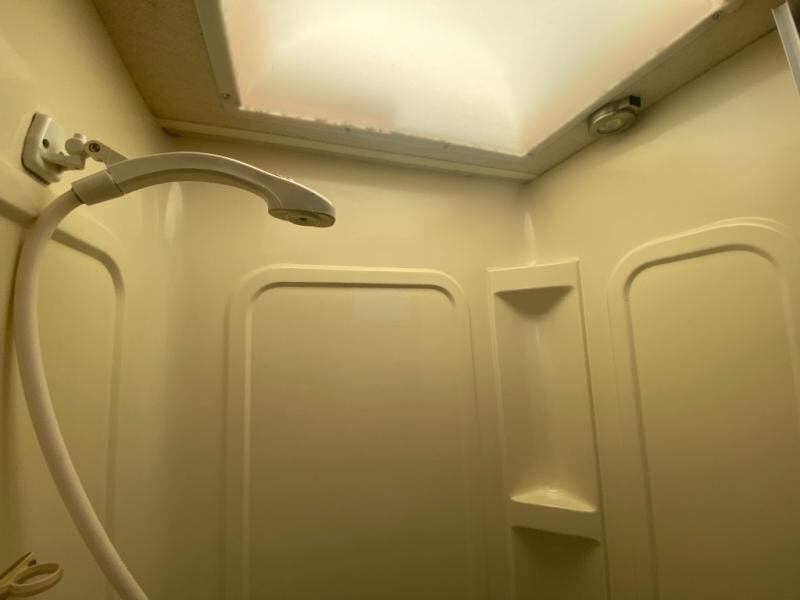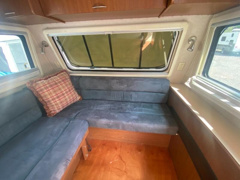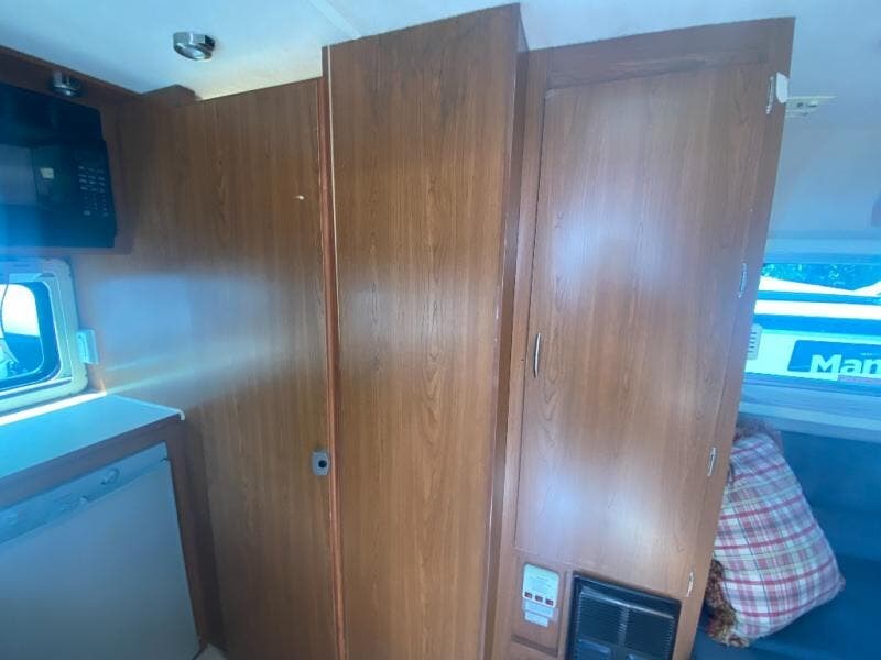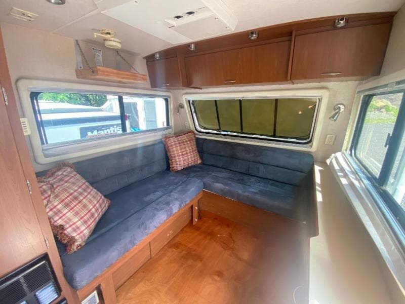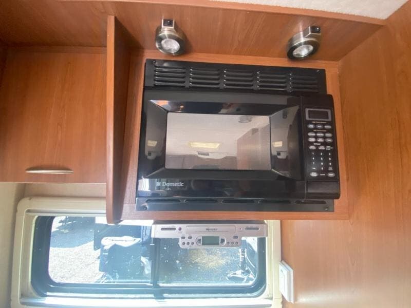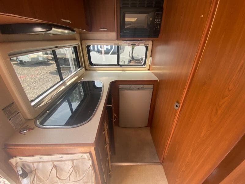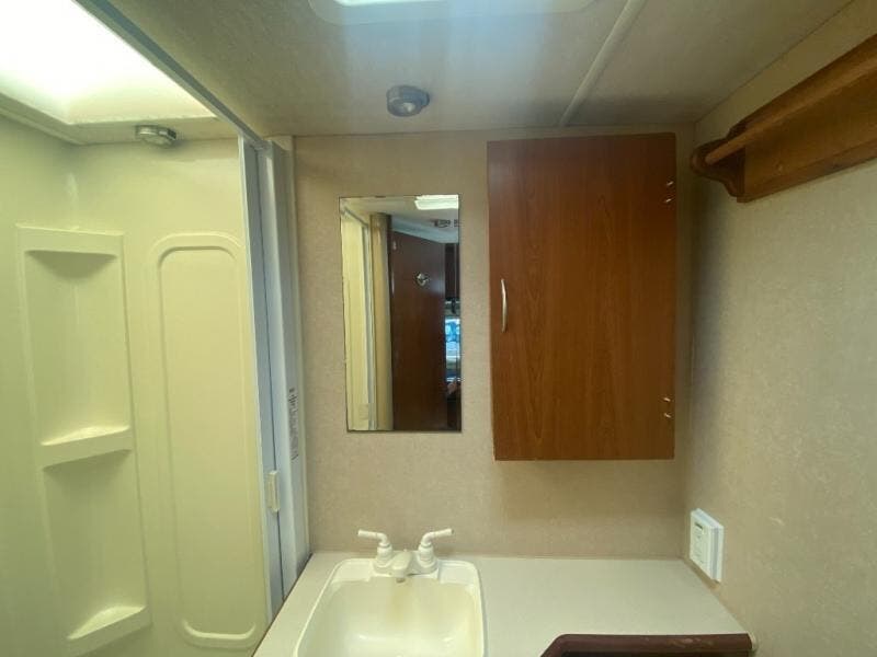 Rear Corner Bath w/Shower, Skylight, Lav., Med. Cabinet, Rear Corner Kitchen w/Microwave, Under Counter Refrigerator, Sink, Cooktop, Drawers & Trash Can, Wardrobe, Storage Cabinet, Slideout Lounge Seat w/Removable Table, Overhead Storage Cabinets and More.