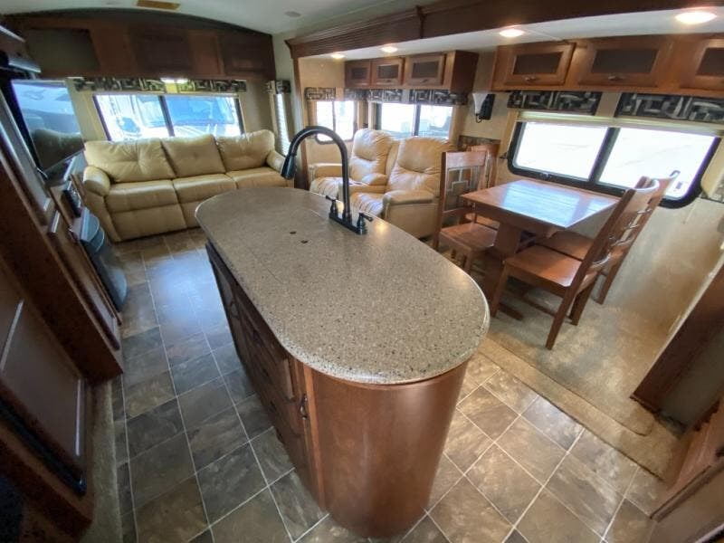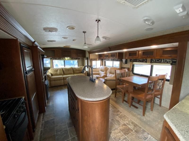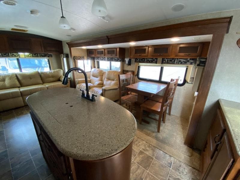 The Spree 328IK travel trailer by KZ offers triple slides and a kitchen island.