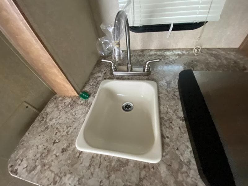 Along the rear of this model is the bathroom area. Here you will find a corner shower, a sink, a toilet, and a wardrobe.