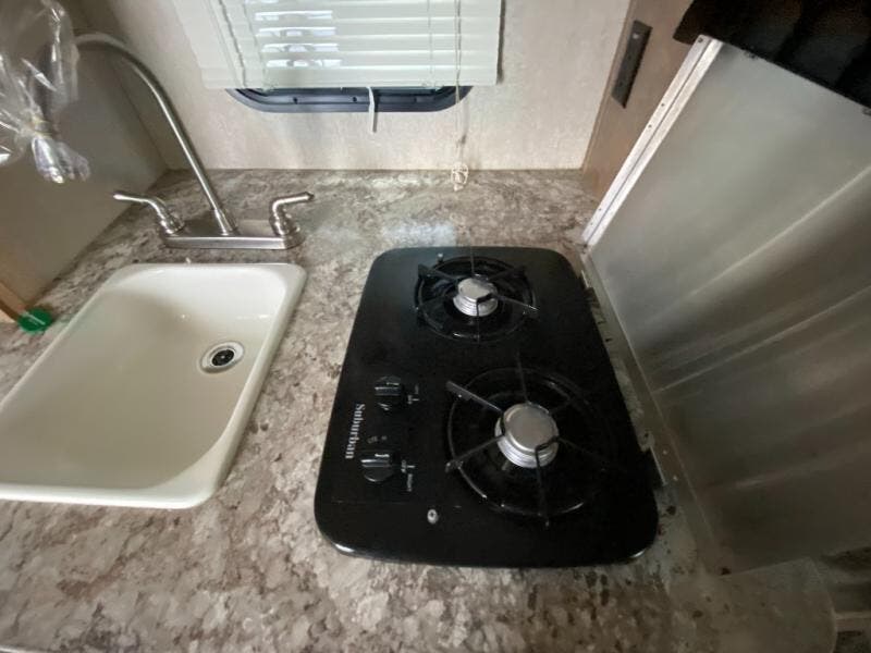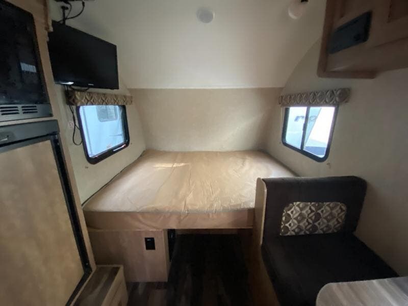 The slide out along the road side features a sink, a two burner range, a refrigerator with an overhead microwave, and an overhead cabinet where you can store dishes. Across from the slide out is the dinette and overhead cabinet, and located along the very front of this model is a queen bed.