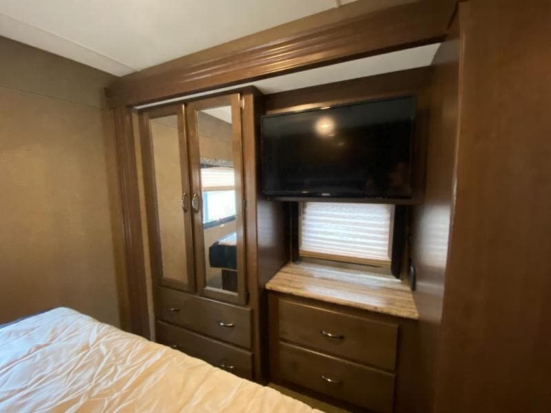 The rear bedroom features a queen bed with nightstands and overhead cabinets. There is also a closet and dresser along the full wall slide. Above the dresser there is a 32" LED TV for your enjoyment.