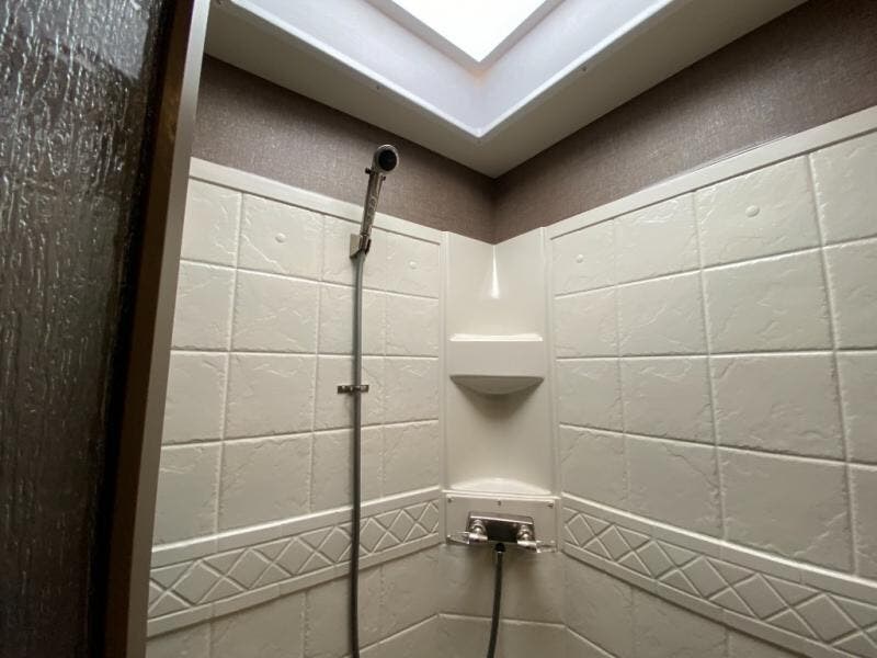 Heading towards the rear of the coach there is a full bath with angled shower, toilet and sink. The bath features dual entry doors which allows easy access from the living area and from the rear bedroom too.
