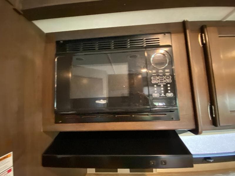 The kitchen amenities provide what you need to create meals and snacks on the go. There is a three burner range with microwave oven, a single kitchen sink, and overhead storage along with a refrigerator found on the opposite side. There is also a pull-out pantry for your non-perishables.