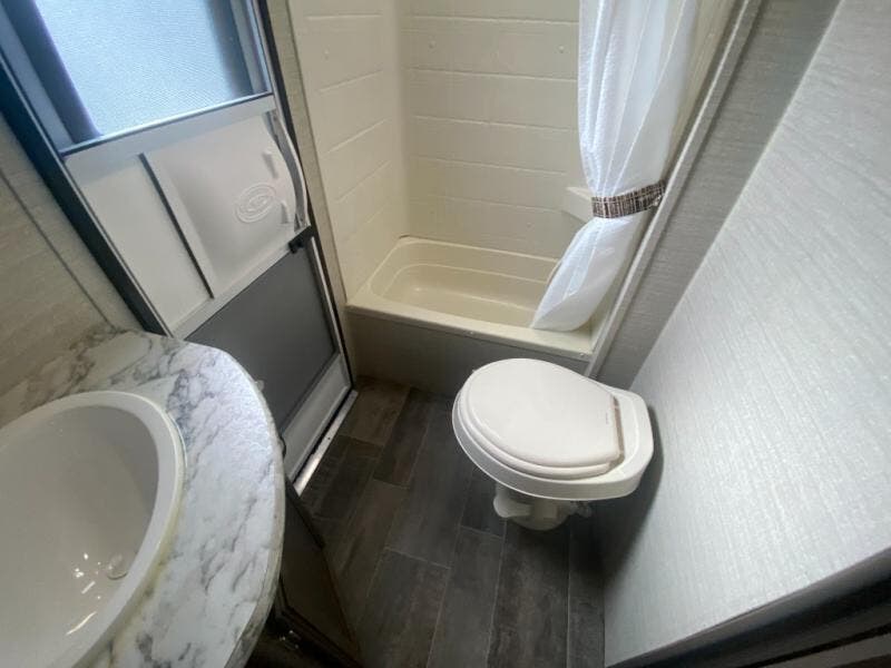 Your family will enjoy any camping trip you take when you travel with this Bullet travel trailer. This is the ideal trailer for a large family because it contains all of the accommodations you need to sleep nine people each night. The single slide maximizes the living space and gives this trailer room for a set of double bunk beds which will have the kids jumping with excitement whenever you tell them it's bed time. Because this unit has a dual entry, you have direct access into the rear bathroom which eliminates mud being tracked all over the clean floors as you make your way to the shower.