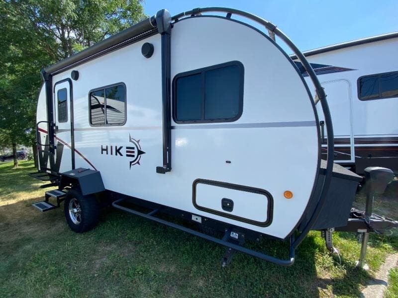 Each one of these Winnebago Industries Towables Hike travel trailers will take you off the beaten path with off-road tires, offset wheels, and robust fenders! The front multi-use gear storage lets you pack in more adventure with space for a battery, LP tanks or adventure gear. Their rugged exoskeleton lets you securely attach a bike or kayak with an exterior powder coated rack system. The exterior fiberglass sidewalls come with an Azdel substrate for an easier tow, and the NXG engineered frame will hold up through all of your adventures. Crank up the tunes with the exterior speakers and relax underneath the power awning with LED lighting!