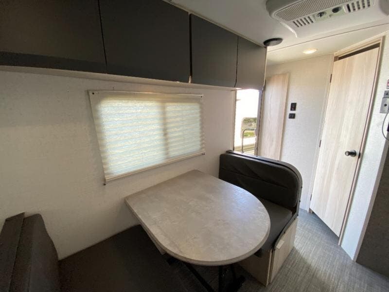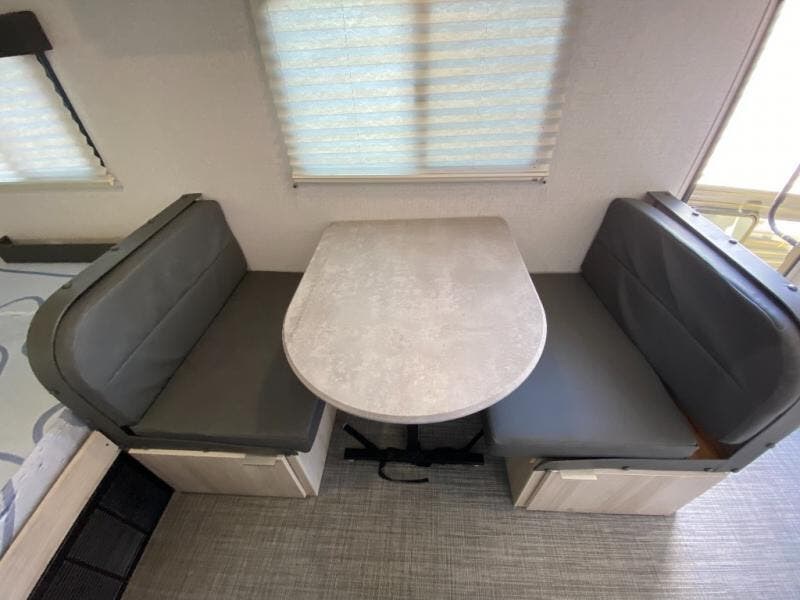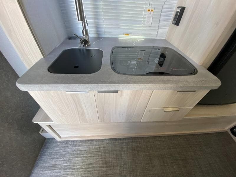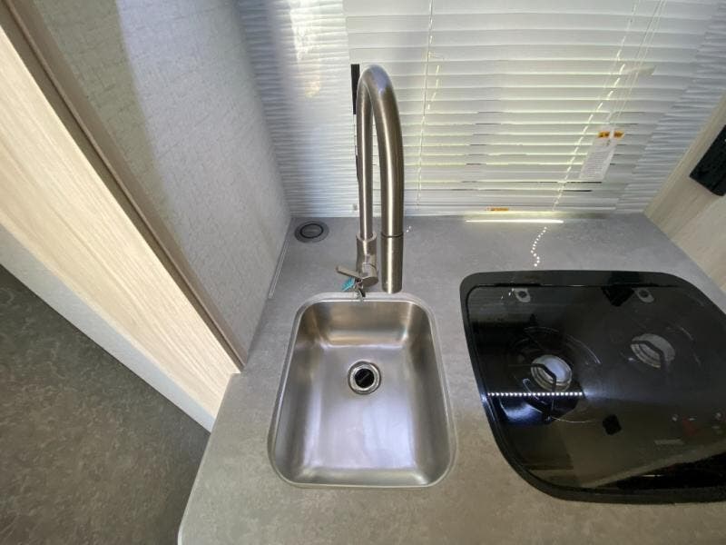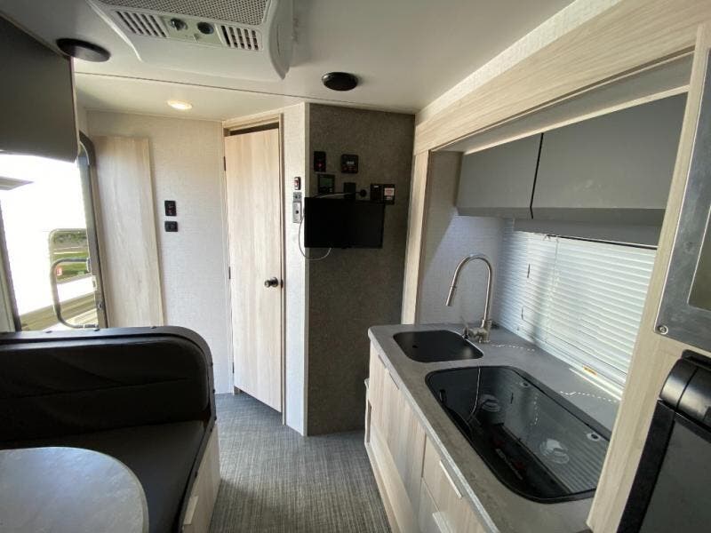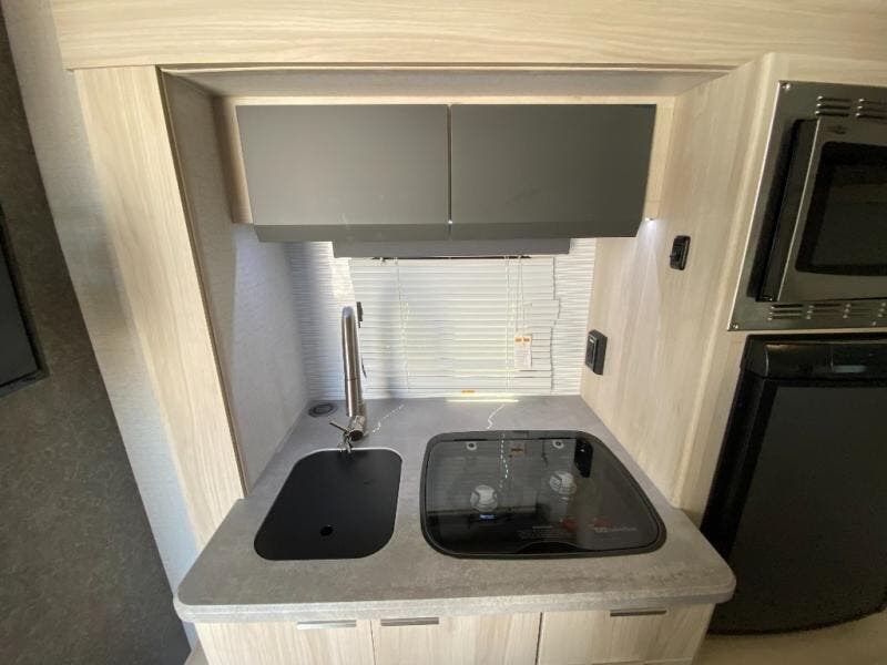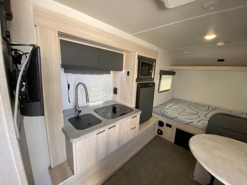 You will experience versatile living off the beaten path in this travel trailer! Depending on the time of day you enter this unit determines whether you will see the front Murphy bed or the sofa. The U-shaped dinette slide can also transform into a sleeping space, and it has a shelf above it and a wardrobe right next to it for you to use as you please. You won't believe how much space is inside the full rear bathroom or how big the wardrobe inside it is too. The kitchen has a recessed three burner cooktop with an oven, a gas/electric refrigerator, and a large pantry to store everyone's favorite snacks, plus there is an exterior pull-out cooktop to grill some burgers while breathing in fresh air!