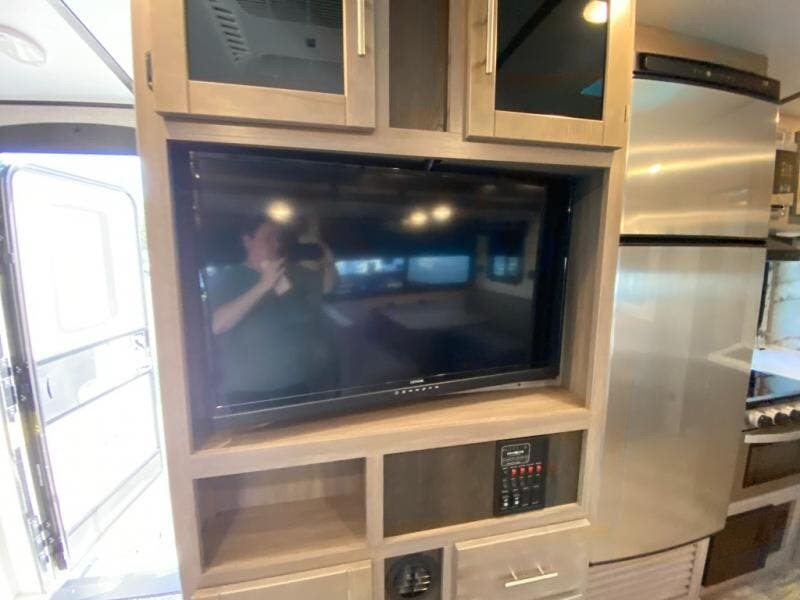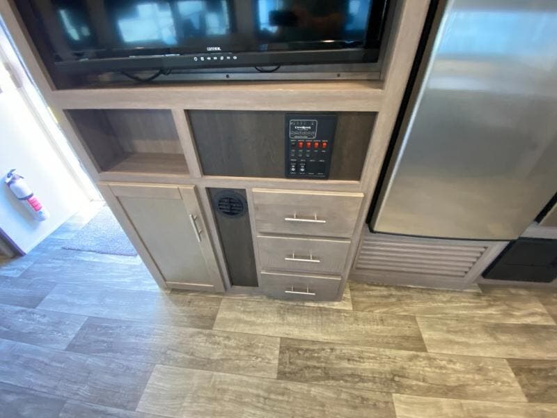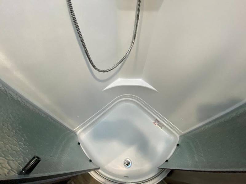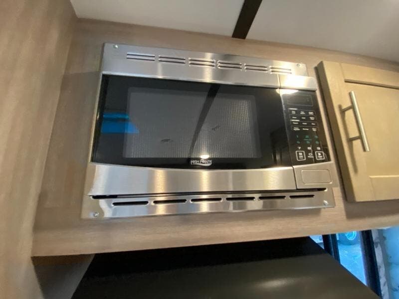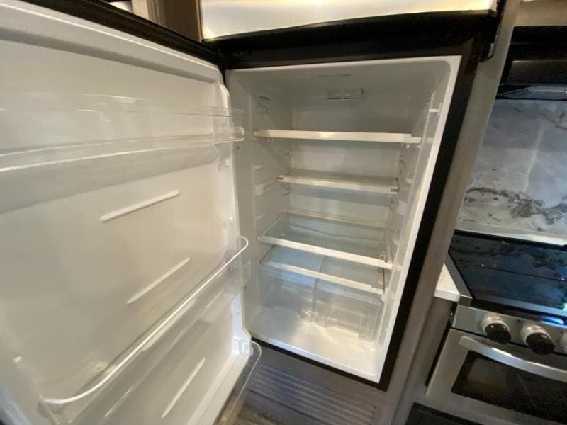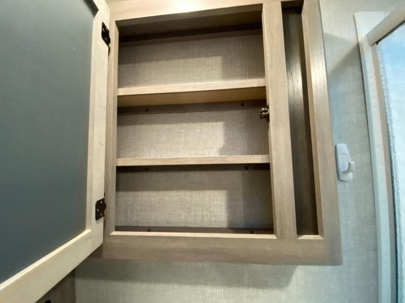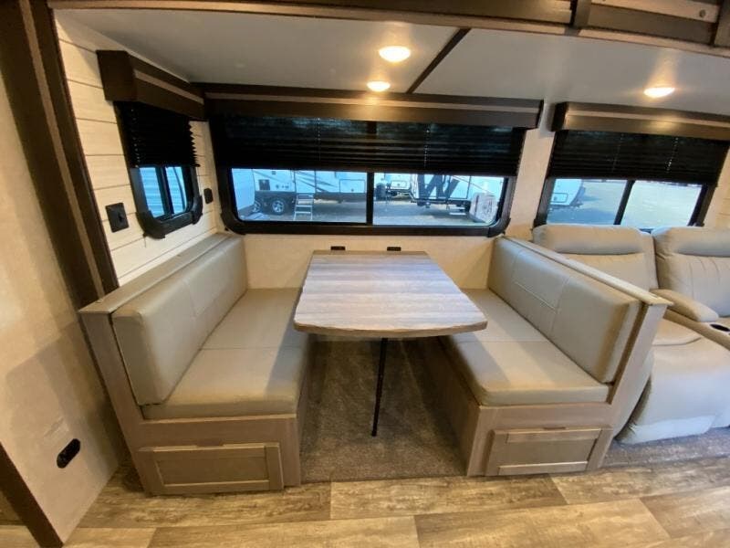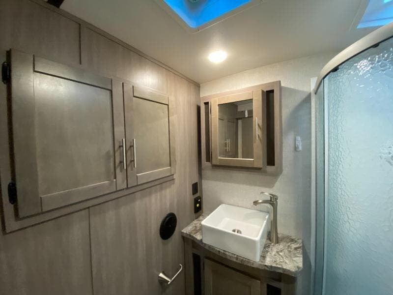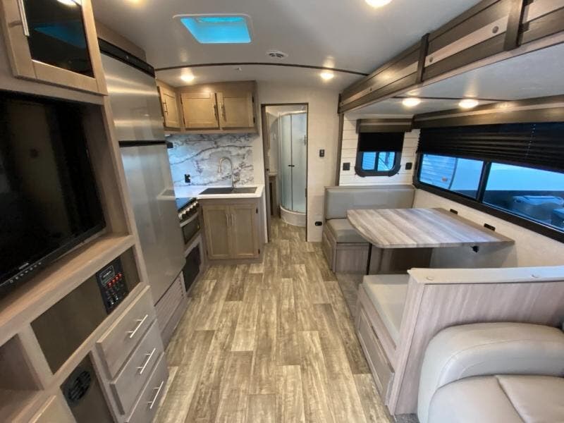 You will love the added interior space you have in this travel trailer thanks to the large slide out in the main living area. Here, you'll enjoy playing cards at the XL booth dinette and relaxing on the tri-fold sofa. Make home-cooked meals on the glass top range or use the exterior camp kitchen. There is even an exterior refrigerator for cold drinks, and the power awning will shade you from the hot summer sun. This model features a full rear bath for added privacy, and the shower skylight will allow natural light in. The front private bedroom includes a king bed, dual wardrobes, plus a shoe storage and pet station for your convenience!