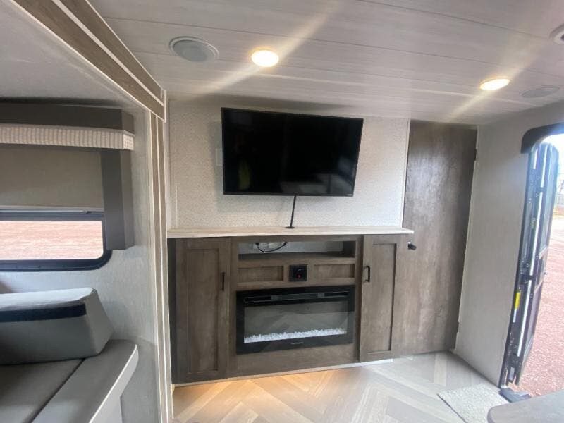 If you need a trailer that will enhance your family getaways, this Wildwood X-Lite travel trailer is it! Because of the double-size bunks in the back and the queen-size bed in the front private bedroom, your family can stretch out and sleep comfortably, and the U-shaped dinette and sofa can also transform into extra sleeping space if needed. The whole family will enjoy how accessible the full bathroom is because it contains both an interior and exterior entry door, and the entertainment center with fireplace is certainly going to enrich your time spent indoors. This trailer also gives you the ability to add an optional outdoor kitchen if you wish.