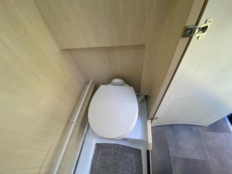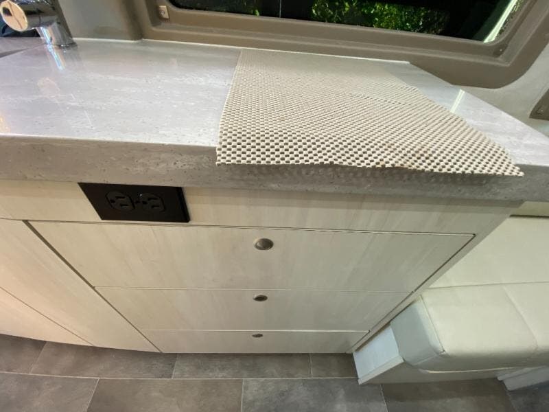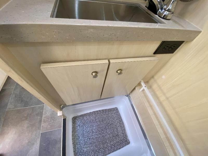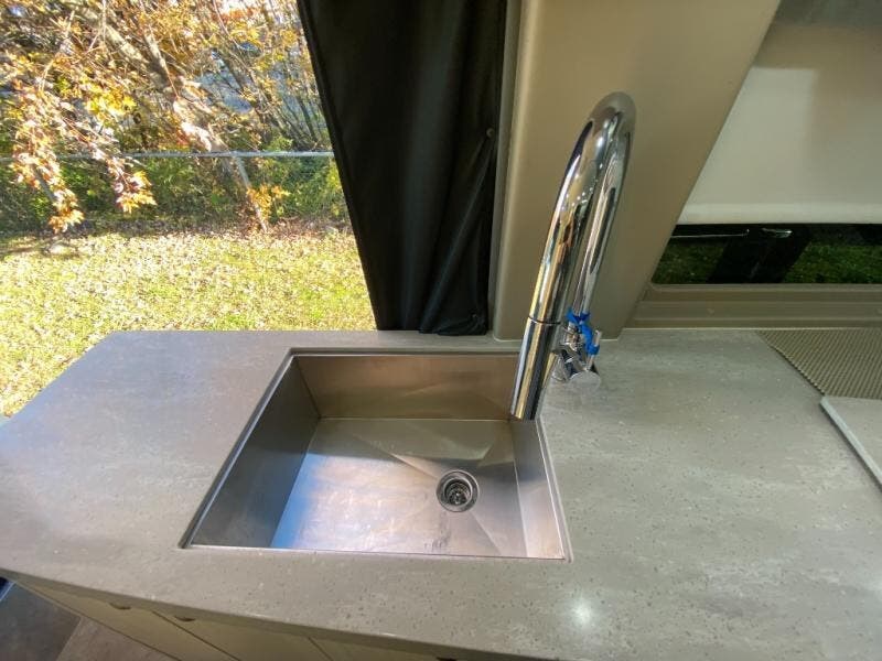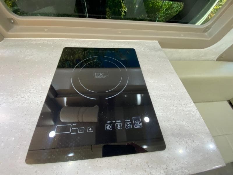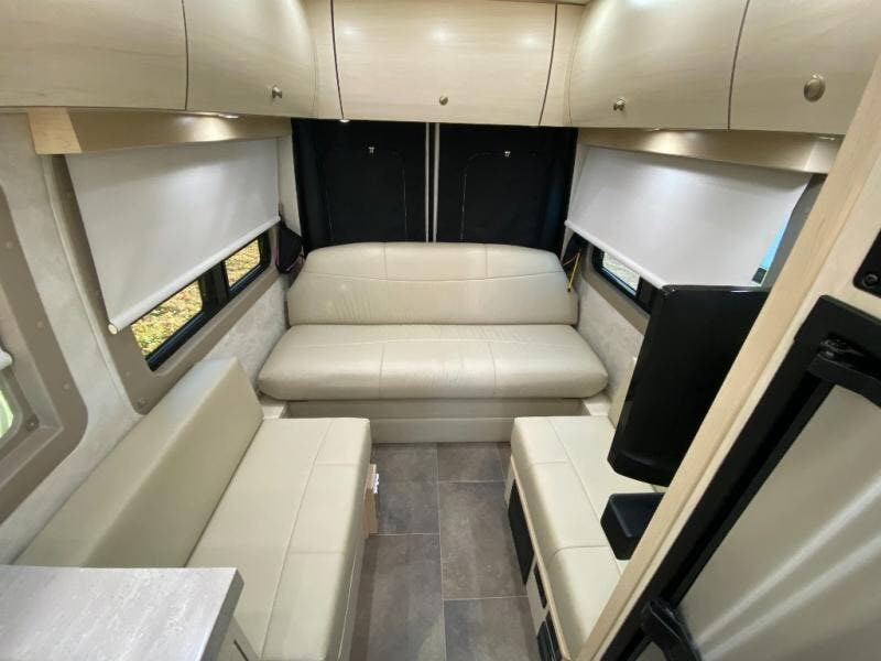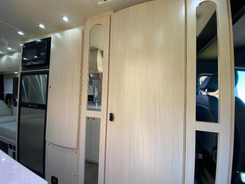 You will experience a comfortable ride in this Plateau Class B diesel motorhome with memory foam sofa cushions. The wet bath comes fully equipped with a medicine cabinet with a mirror, a Corian countertop, a towel rack, plus a handheld showerhead. The exterior shower also has a handheld showerhead to make rinsing off the mud even easier. All of the seating throughout is covered in Ultraleather fabric, including the swiveling captain's chairs. With the generous amount of available storage in the full-size wardrobe, you can easily reach any of your hang-up clothes!
