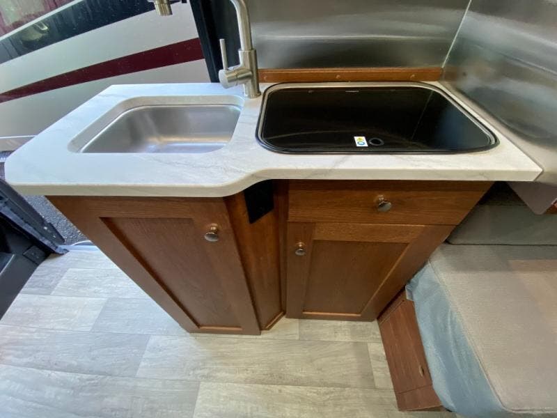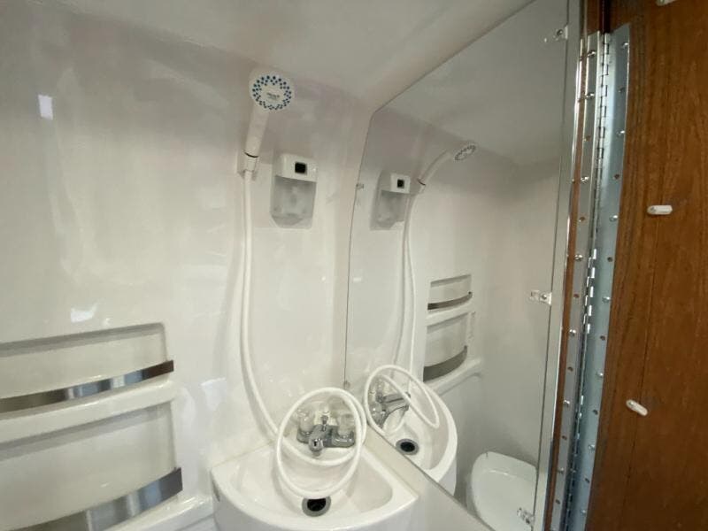 This is the perfect motorhome to take out when you're ready to play! You'll find plenty of storage space for items small and large, including a large pot drawer in the kitchen! The side-facing rear power sofas can convert to twin beds or a king-size bed, plus you can add the optional folding mattress to go over the front captain's seats if a grandkid tags along. Prepare breakfast on the two-burner propane stove or use the microwave oven if you're on-the-go. The wet bath with a sink, shower and toilet will allow you to freshen up after a day of hiking, and the 13' power awning outdoors will provide shade if you choose to dine outdoors for dinner.