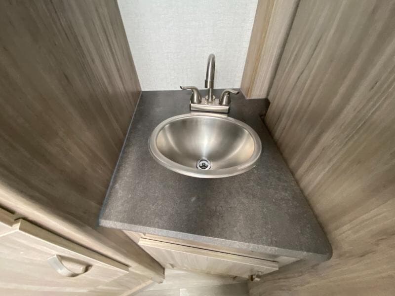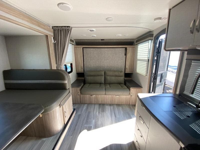 If you're looking for versatility then you need this travel trailer! Depending on the time of day you enter will determine whether you see the Murphy bed or the sofa up front. A slide out 44" x 72" booth dinette can be used for dining, playing games, and sleeping space at night. The full rear bathroom is equipped with everything you will need to freshen up each morning and features a wardrobe for your clothing and linens, and a pocket door into the bath saves space in the main room. The LED TV is conveniently located so you can watch your favorite shows from the sofa or Murphy bed as well as the dinette, plus the pantry offers a place to store your snacks and such for easy access. The cook in our bunch will love all the amenities to make meals including the handy flip-up counter for more prep space.
