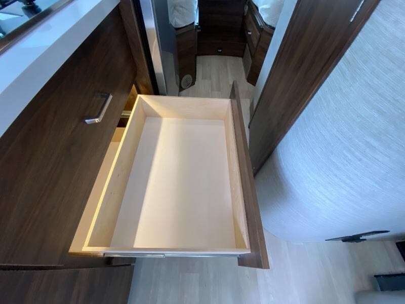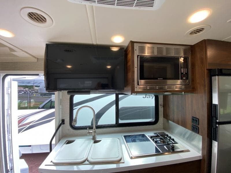 This versatile View Class C diesel motorhome gives you the ability to sleep in twin beds each with a wardrobe at the foot of the bed, or you might like to use the Flex Bed system to convert them into one 74" x 87" king bed. Other sleeping spaces include the bunk above the cab that the kids will love, and the TrueComfort+ sofa slide out which includes a table for dining, playing games, or maybe getting a little work done. You might even decide to add the optional seating with table instead if you don't think you will need the extra sleeping space. The cook will have all the necessary appliances to make warm meals including a convection microwave oven and an LP/induction cooktop, and the curved cabinets and lighted soft-close galley drawers create an upscale cooking experience.