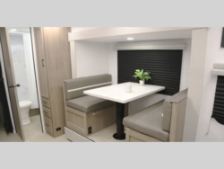 Camping with more friends and family is possible in this bunkhouse travel trailer! There is a double-size top bunk plus a double-size lower flip-up bunk for comfy sleeping space and additional storage space. You'll find your own bed up front with underbed storage and dual wardrobes to keep clothes wrinkle-free. Since there is a booth dinette slide out, you'll have additional interior space plus a place to dine, play games, and even let an extra guest sleep over. The full kitchen includes a dual burner cooktop and microwave oven to cook meals each day, along with a pantry and 12V refrigerator for food storage. And a full bath on board means you won't have to use the camp's facilities to freshen up each day; how convenient!