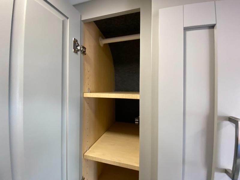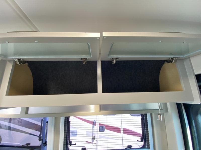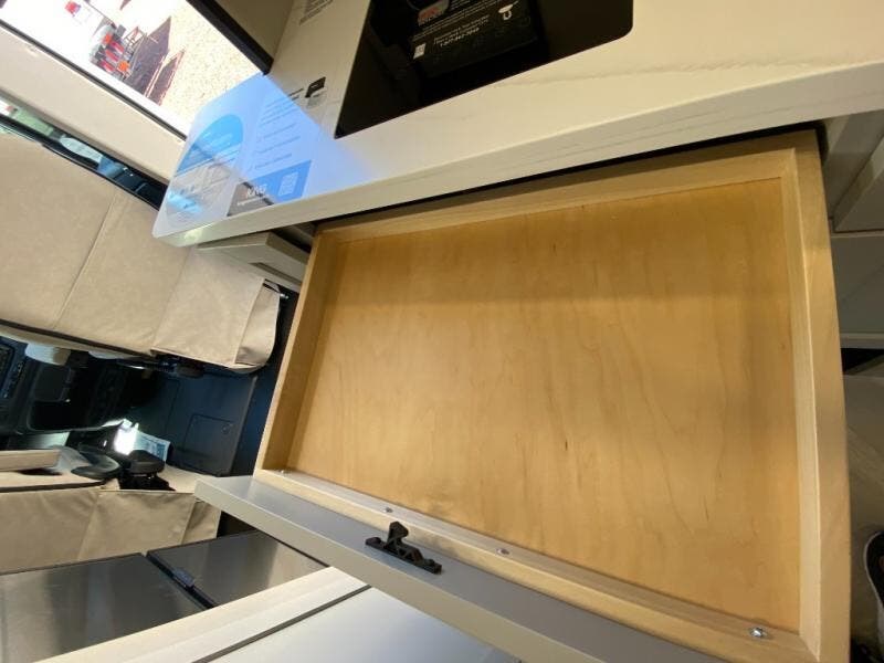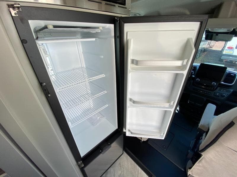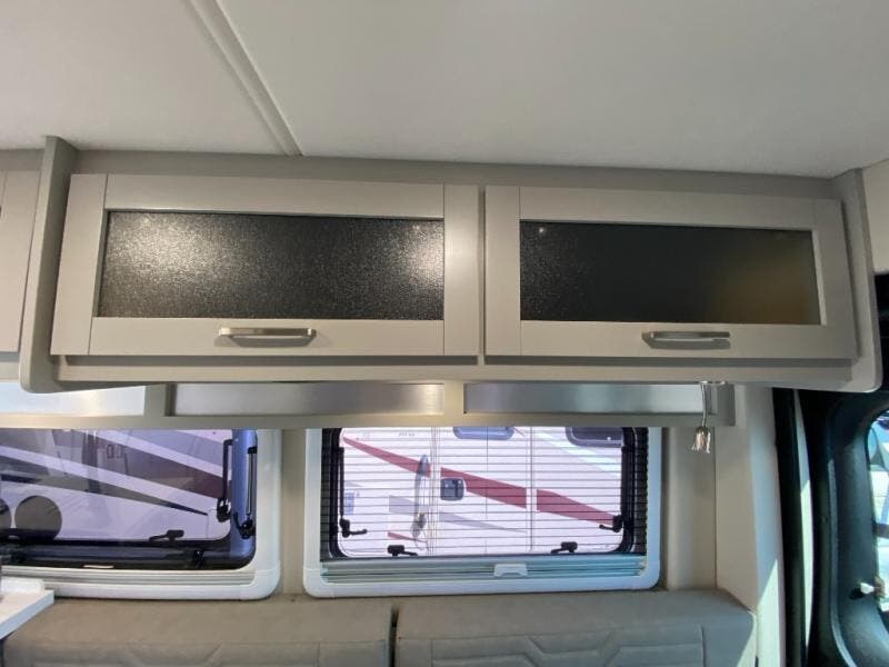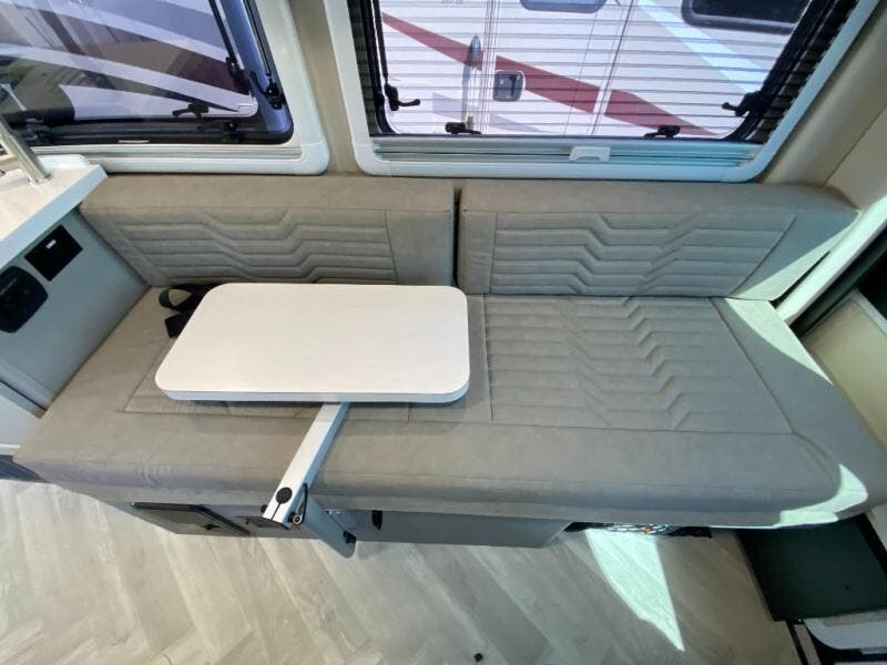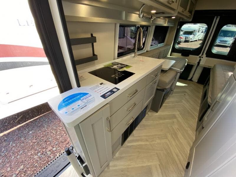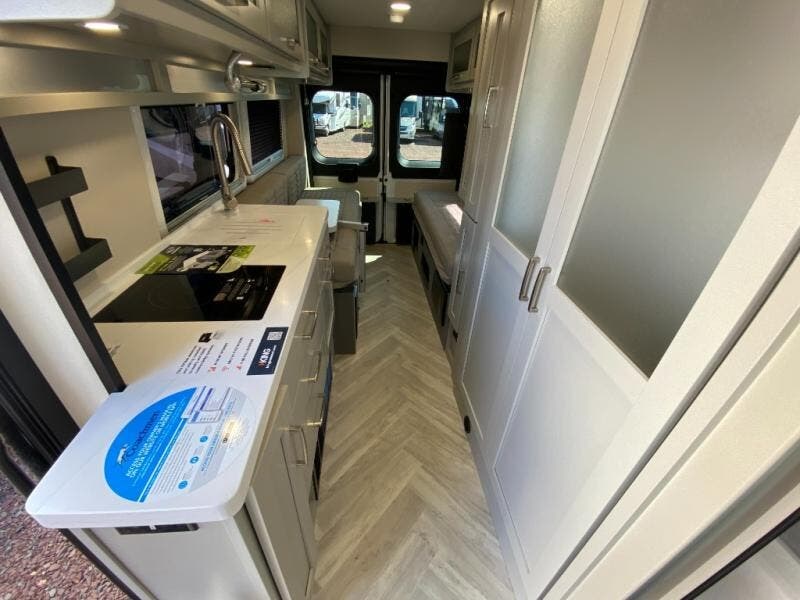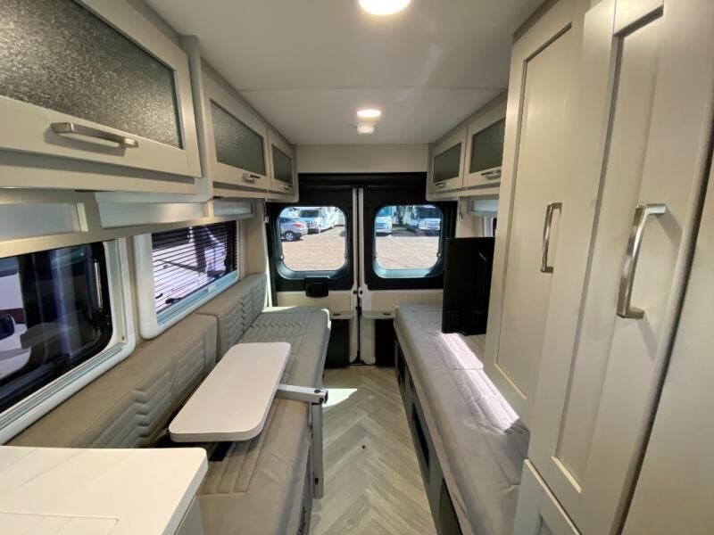 Hit the road and enjoy each journey in this Nova Class B coach. Once you park for the day, you can swivel the captain's seats around and utilize the swivel table. Lunch can be made on the induction cooktop, and the cold ingredients can go back in the 7.3 cu. ft. refrigerator. The convenient wet bath allows you to freshen up after a day exploring, and when you're ready to turn in for the night you can choose from either two 75" x 26" beds, or combine them to create a 75" x 73" bed instead. You will find ample storage in overhead cabinets along each side, beneath the bed, plus there is an extra wardrobe on the roadside as well.