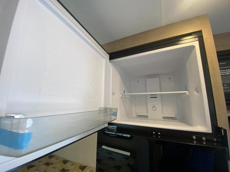 Time at the campground in this travel trailer will be time well spent. Once you arrive at your destination, you can put out the 14' electric awning, unpack the pass-through storage, then head inside for lunch. There is an air fryer convection microwave plus a dual burner cooktop to make meals each day, and the 10 cu. ft. 12V refrigerator will keep your food fresh. A legless dinette slide provides a place to dine together and even let a guest sleep over. If you're not needing the extra sleeping space, just choose the optional theater seating! You'll find the front queen bed will give you a great night's rest, and there is a full rear bath on board that will allow you to freshen up each morning.