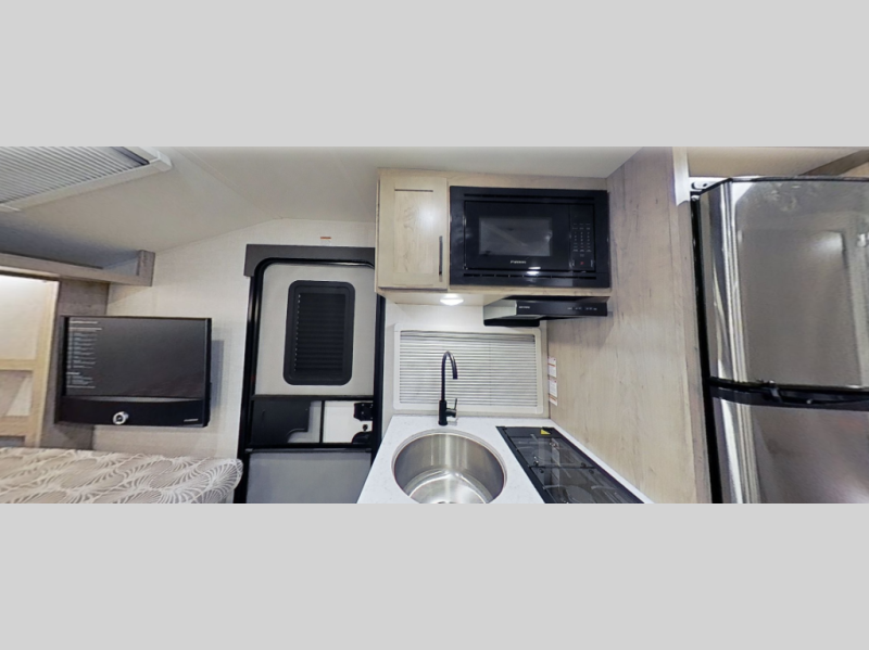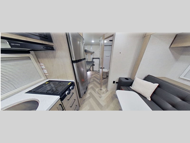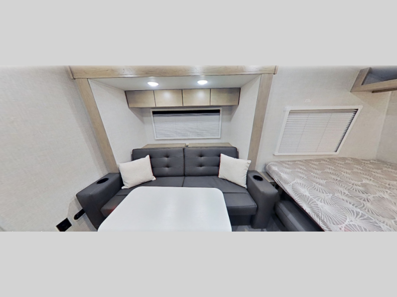 This unique travel trailer offers versatile living! Starting with the front Murphy bed that has a 60" x 80" queen bed to lay your head on at night and can convert into a sofa for seating during the day with a nightstand and a 12V HDTV/AV system to watch your favorite movies in bed. Create your best home cooked meals with the two burner cooktop and 12V refrigerator then enjoy them at the jackknife sofa slide with a removable table. Behind the sofa are dual storage cubbies and it can also convert into an extra sleeping space. The repositionable Embertack E-track bunk/storage system has a 74" x 46" cargo space for your items and a storage locker door to access them from the exterior. You can enjoy twin bunks or convert them to double-size bunks to sleep two to four. The exterior also has a kayak/bike storage door, front pass-through storage area, and a 2" accessory receiver!