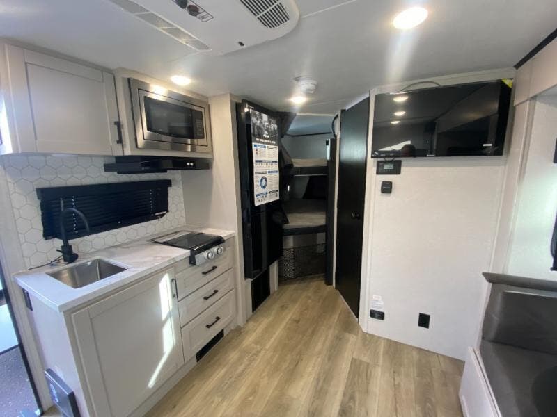The double-size bunks in this travel trailer mean more friends and family can tag along! Once you arrive at the campground, you can put out the 15' power awning, unload the exterior storage and start lunch on the exterior griddle. A full kitchen indoors will let you make meals here when the weather isn't cooperating. The booth dinette slide will be perfect for meals times, game night, and even additional sleeping space. Up front, you'll find a sofa to relax on during the day and a Murphy bed to sleep on at night; how convenient!