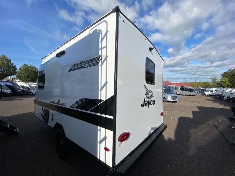 The Jay Feather Air SL travel trailer by Jayco is affordable, convenient, and lightweight for an easier tow! A Magnum Truss roof system and fully integrated A-frame provide a strong foundation to the trailer, plus there are galvanized-steel, impact resistant wheel wells for added protection. Some of the exterior conveniences you'll find include a front tongue jack and stabilizer jacks, roof mount solar prep, an exterior porch light, and G20 dark tinted privacy windows. Head inside to enjoy solid hardwood cabinet doors, residential-style kitchen countertops, a marine-grade toilet with foot flush, and vinyl flooring throughout that will be easy to keep clean. This super lite travel trailer is the perfect choice for rookie RVers and seasoned campers alike!
