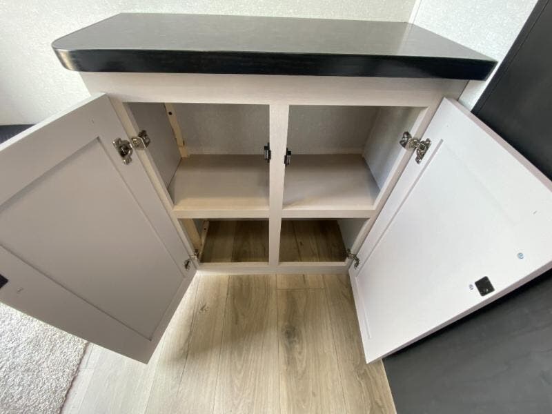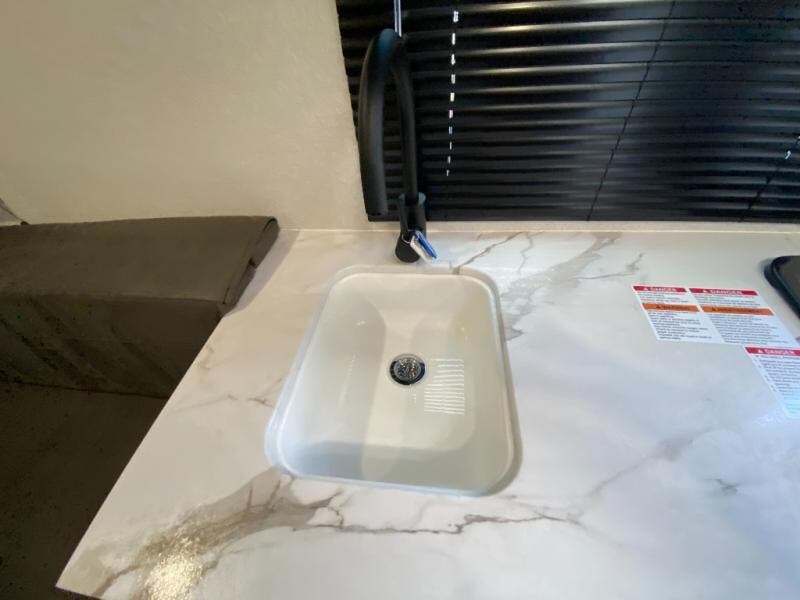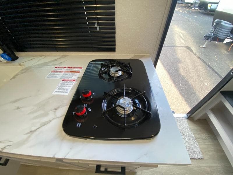 You'll love camping in this lightweight and versatile travel trailer! Once you've arrived at the campground and have unpacked your things, you can make a quick lunch on the two-burner cooktop. There are two 32" x 74" twin-size bed/benches that include a table for a king-size bed conversion, and you'll find a large overhead cabinet here to keep books or board games stored away. A private bath includes a shower and a toilet to easily clean up each day, and a dresser just outside the bath will let you keep clothes or towels organized. Don't let this cozy travel trailer slip away!