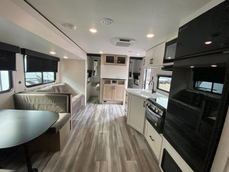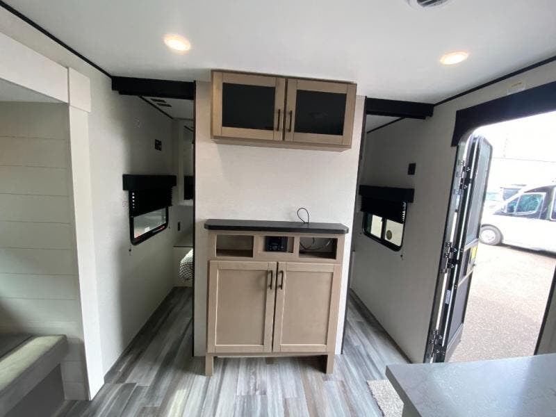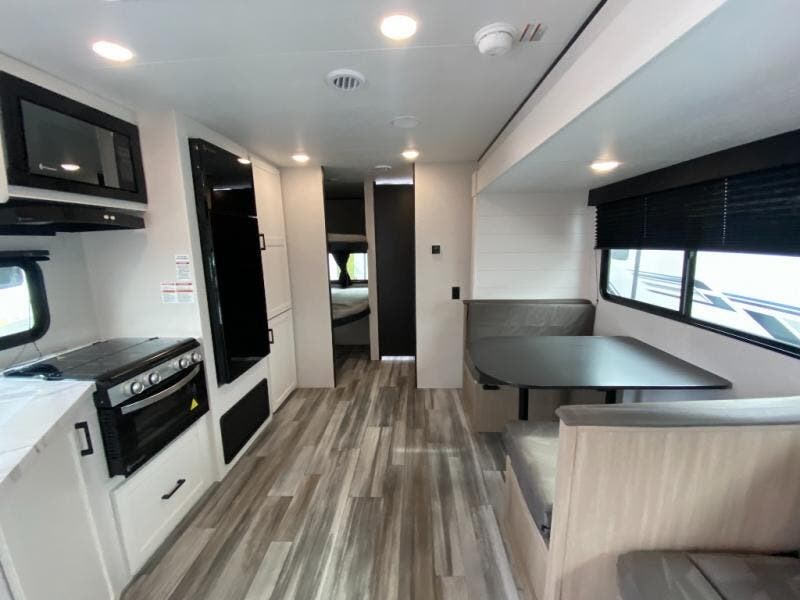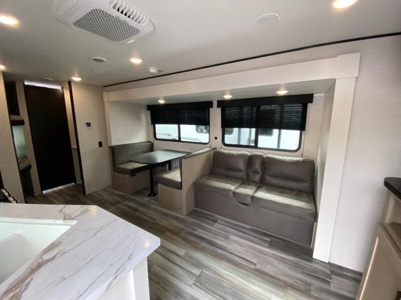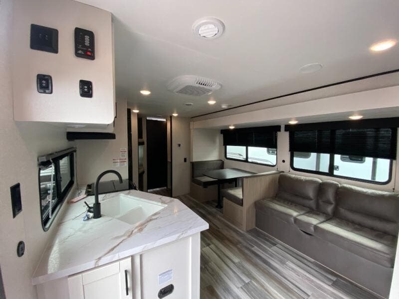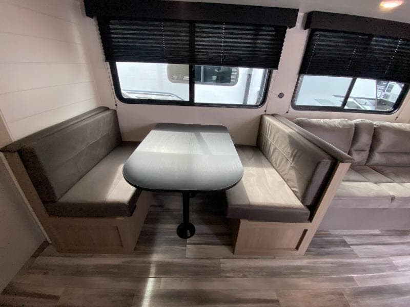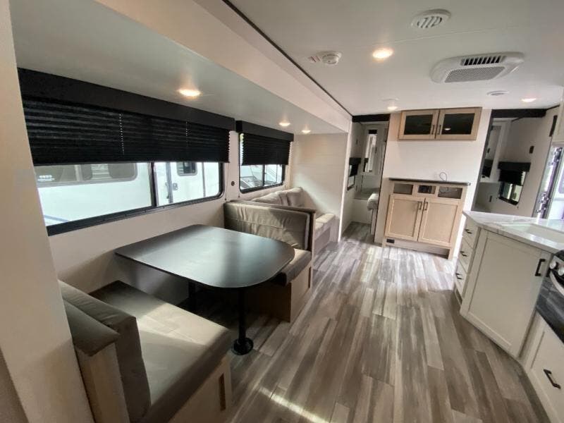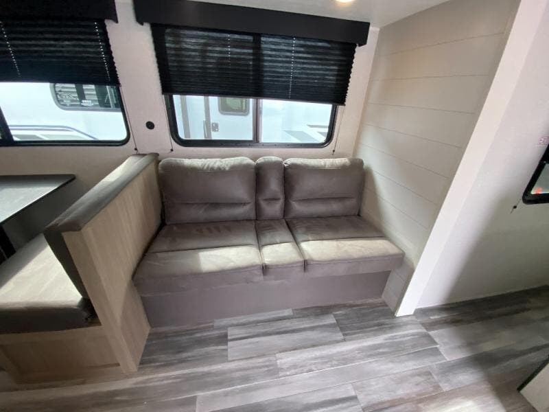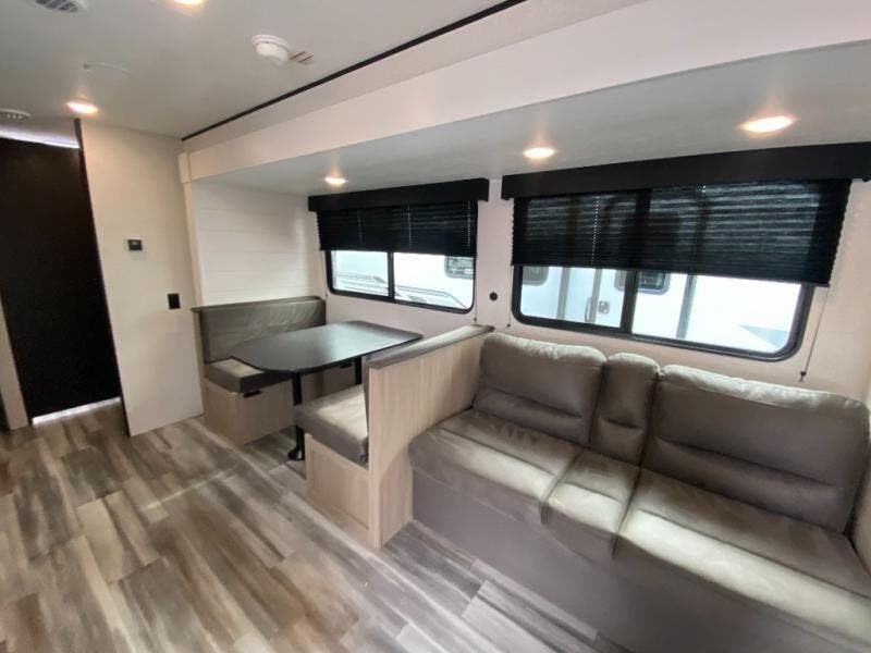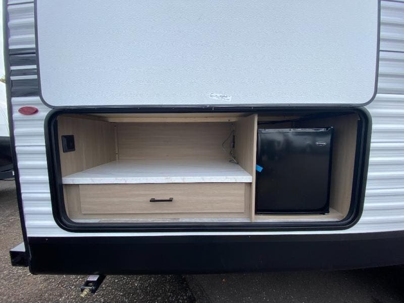 You can comfortably sleep up to ten people in this trailer thanks to the double-size bunks in back, the RV queen bed in the front bedroom, plus the booth dinette and jack-knife sofa in the main living area! The chef of your crew will have a three burner cooktop and microwave oven to prepare meals, and everyone can store their favorite drinks in the 8 cu. ft. 12V refrigerator inside, or in the outdoor refrigerator for convenience. The rear corner bathroom includes a shower and a toilet, with the sink just outside of this room so others can brush their teeth if one is taking a shower before bed. The outside storage is accessible on both sides of the unit and will easily allow you bring along camp chairs, yard games and more. A 16' powered awning with LED lights will create a nice place to gather in the evenings with family and friends!