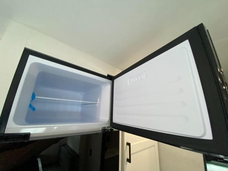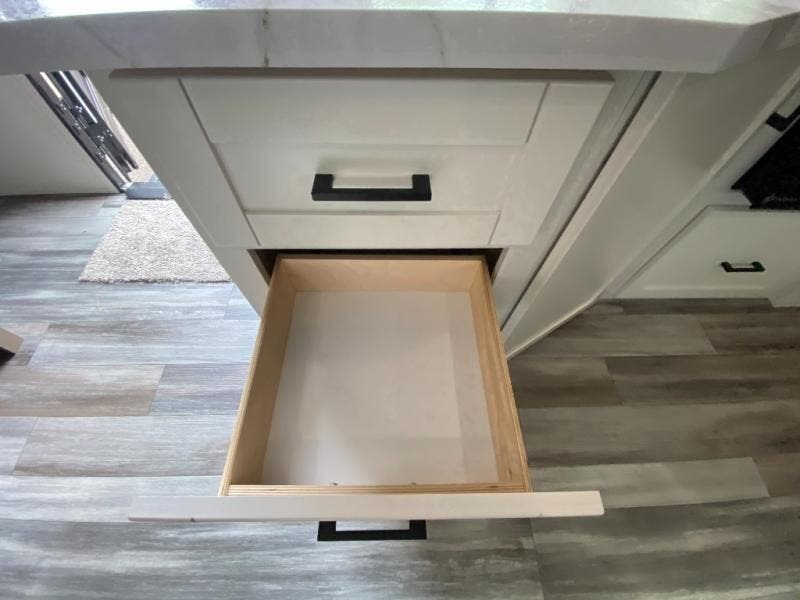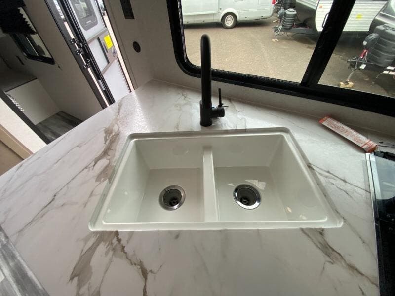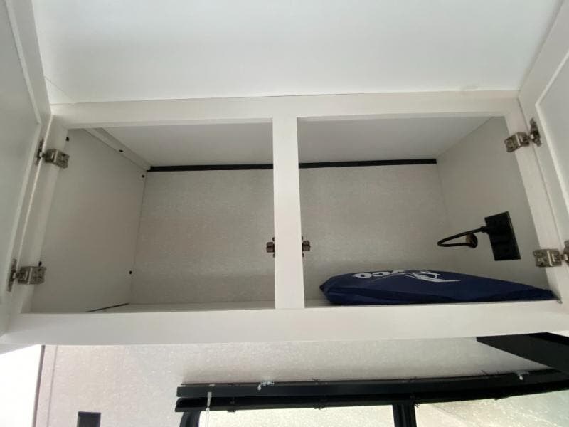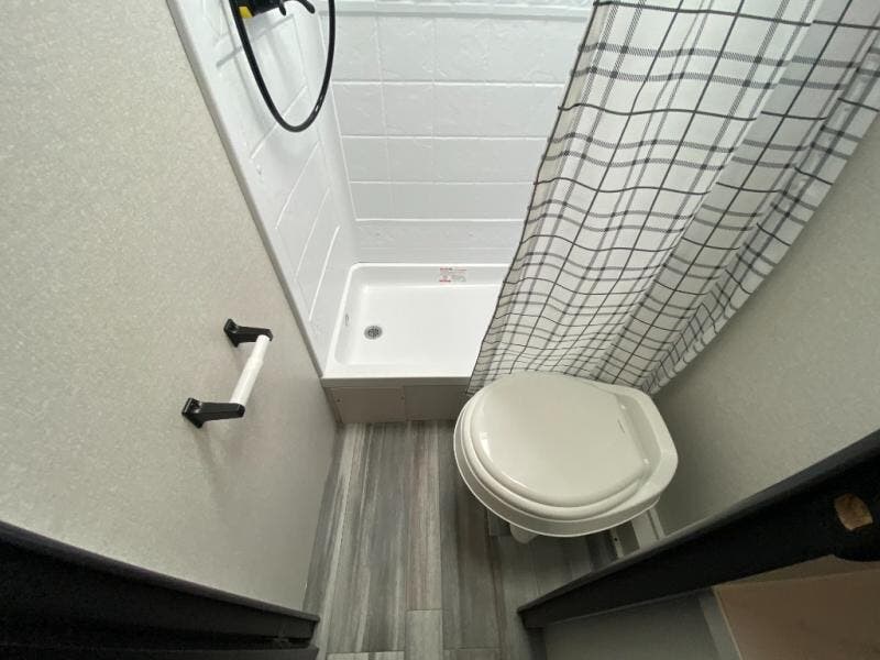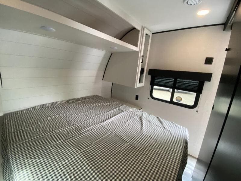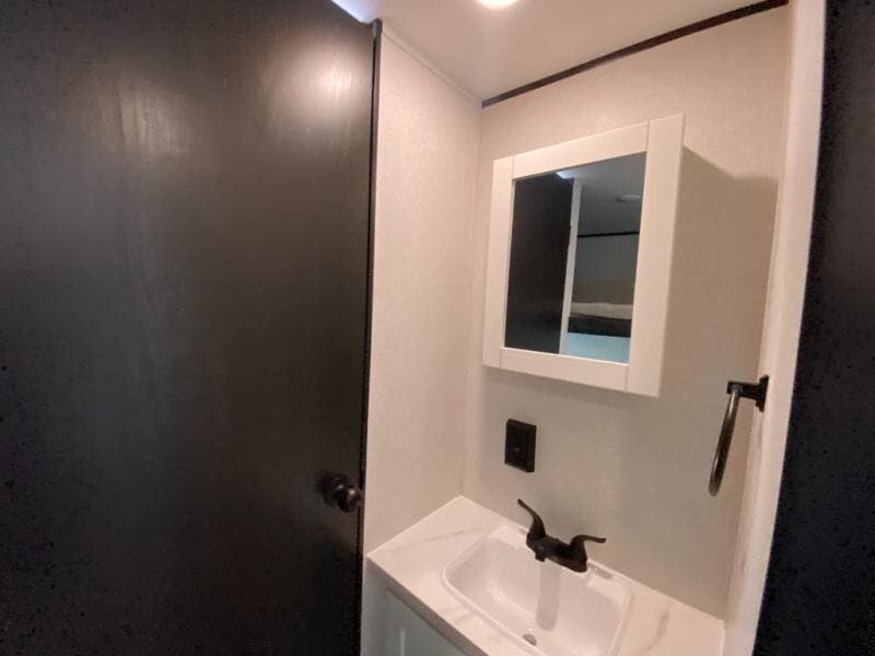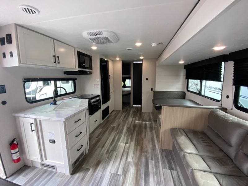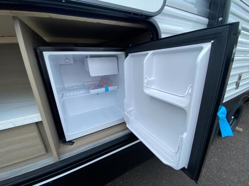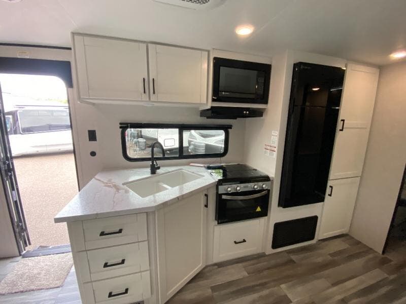 You can comfortably sleep up to ten people in this trailer thanks to the double-size bunks in back, the RV queen bed in the front bedroom, plus the booth dinette and jack-knife sofa in the main living area! The chef of your crew will have a three burner cooktop and microwave oven to prepare meals, and everyone can store their favorite drinks in the 8 cu. ft. 12V refrigerator inside, or in the outdoor refrigerator for convenience. The rear corner bathroom includes a shower and a toilet, with the sink just outside of this room so others can brush their teeth if one is taking a shower before bed. The outside storage is accessible on both sides of the unit and will easily allow you bring along camp chairs, yard games and more. A 16' powered awning with LED lights will create a nice place to gather in the evenings with family and friends!