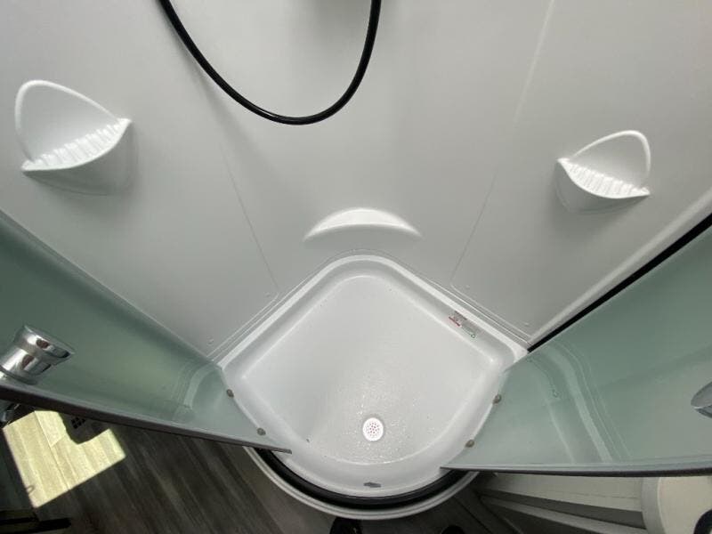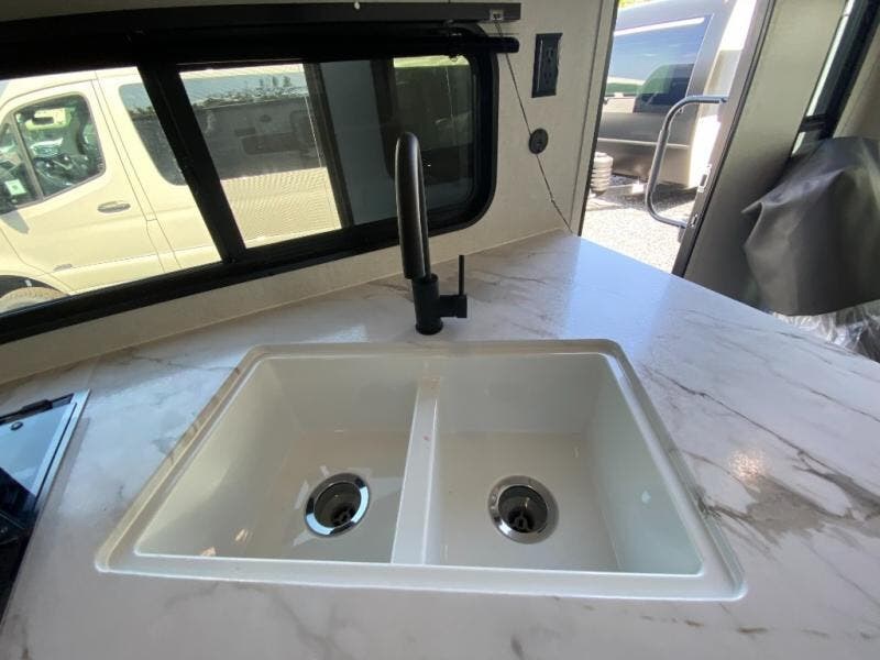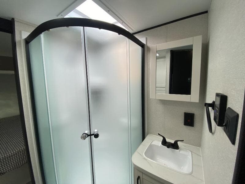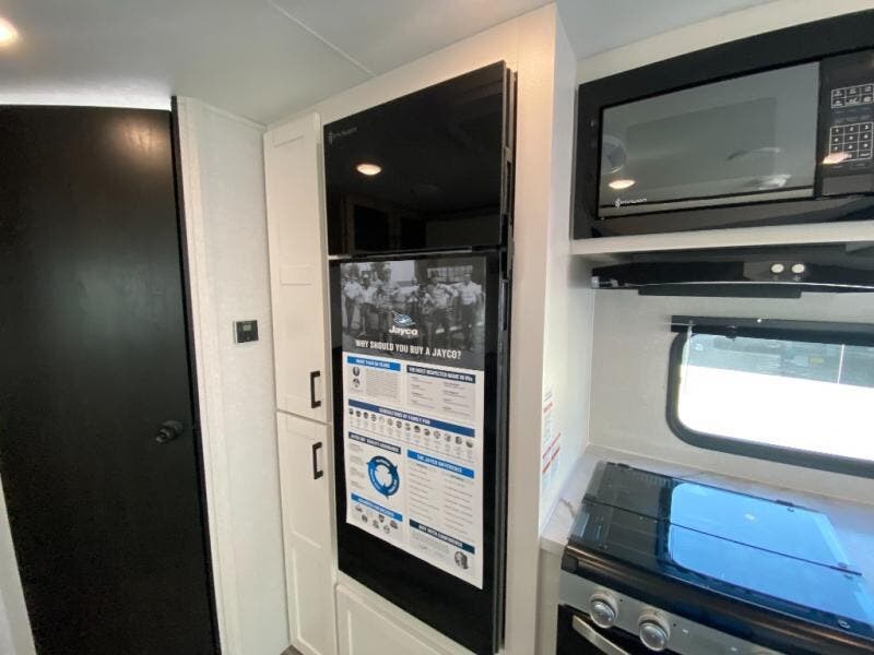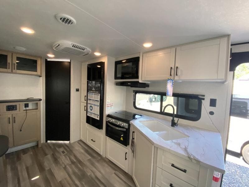 You can comfortably sleep up to six people in this trailer thanks to the RV queen bed in the front bedroom, plus the booth dinette and jack-knife sofa in the main living area! The chef of your crew will have a three burner cooktop and microwave oven to prepare meals, and everyone can store their favorite drinks in the 8 cu. ft. 12V refrigerator. The walk-through bath is spacious and includes a radius shower, toilet, a sink, and linen closet and is the full width of the unit. The outside storage will let you bring along camp chairs and games, fishing poles and more, plus the 18' 3" power awning with LED lights will create a nice place to gather in the evenings!