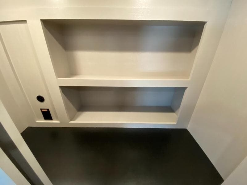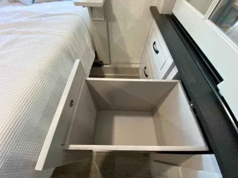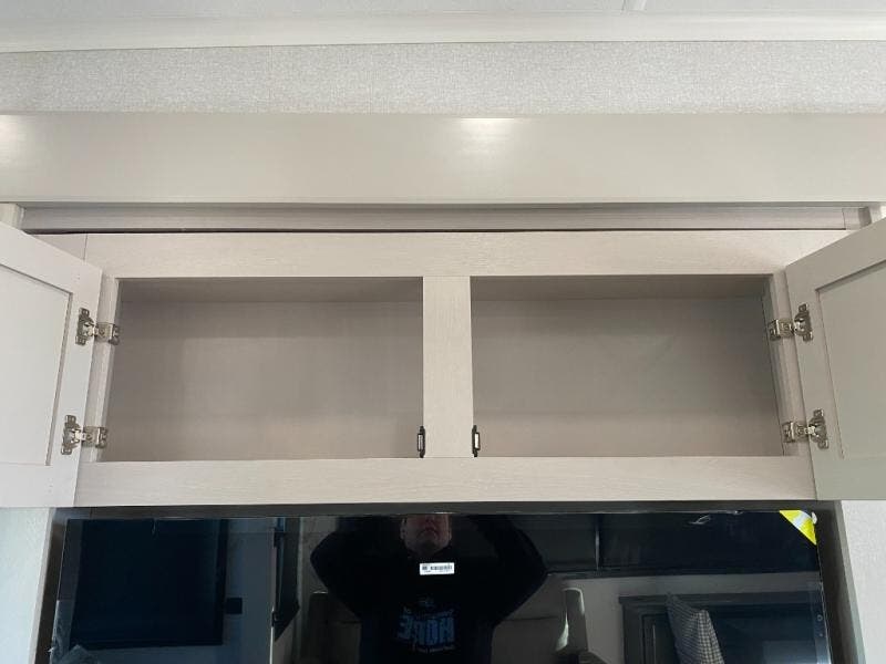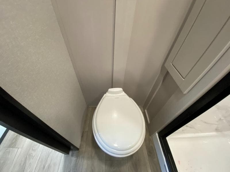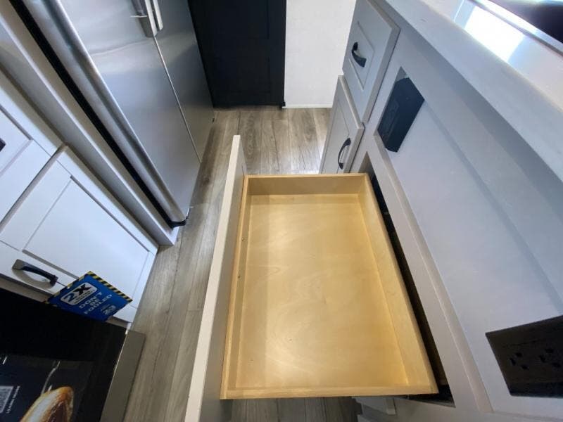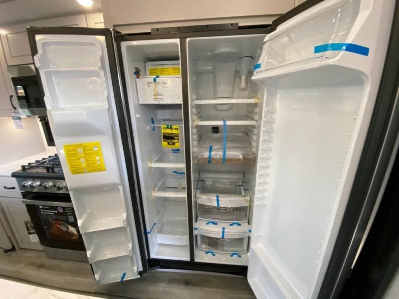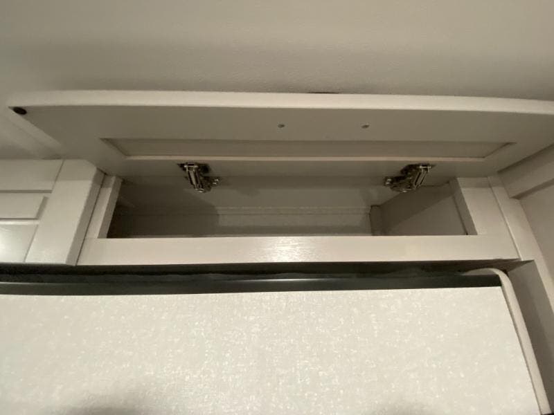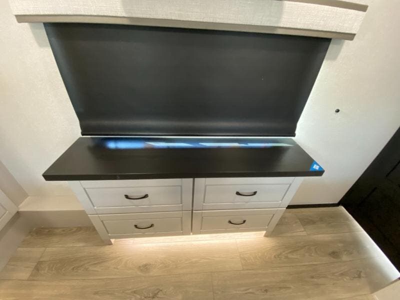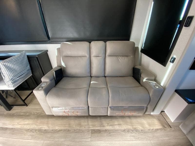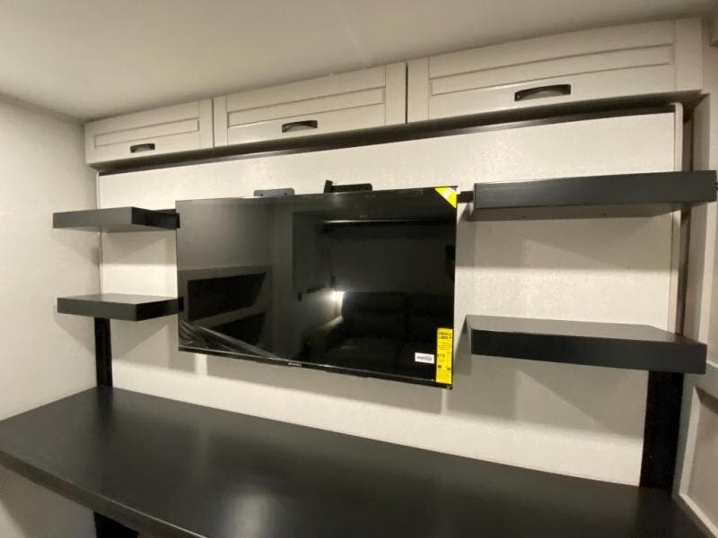 You can work from anywhere with this fifth wheel thanks to the middle bonus room that offers a desk with TV above, a tri-fold sofa with removable table, a flip-up bunk and a closet. This multi-use room works for just about anything including an extra living area and bunkhouse. The shoe storage under the interior steps, the linen cabinet in the full bathroom, the walk-in closet in the bedroom, and the overhead cabinets plus exterior storage allows you to bring whatever you want. Enjoy cooking in the kitchen that provides an island with a flip-up butcher block, a residential refrigerator, a pantry, and everything you need to keep everyone fed. The theater seats, the tri-fold sofa and the free standing table without a pedestal are great places to sit while watching the 50" Smart LED HDTV with fully digital HDMI output and home entertainment system with subwoofer, plus there is a fireplace below for those chilly evenings.
