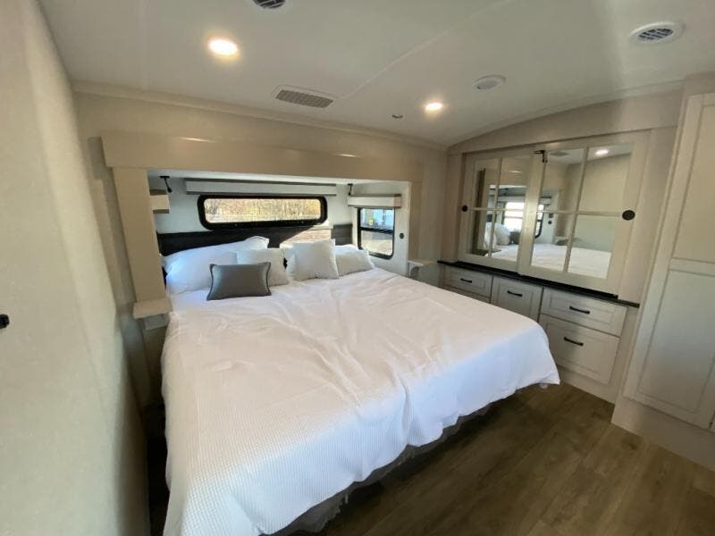 The New 2026 Jayco North Point 377RLBH is a luxury fifth wheel with a rear living and mid-bunk layout, spacious kitchen with residential appliances, and a private master bedroom. Built with Jayco’s durable construction, panoramic windows, and advanced climate control, it combines comfort, storage, and high-end features for extended travel and full-time RV living.