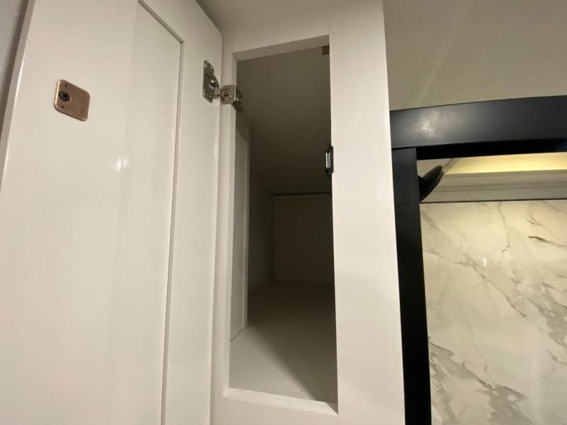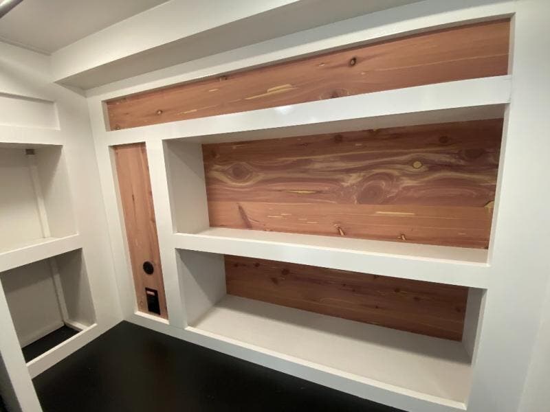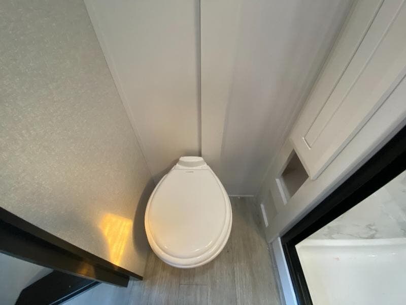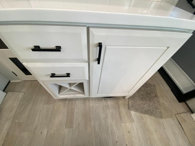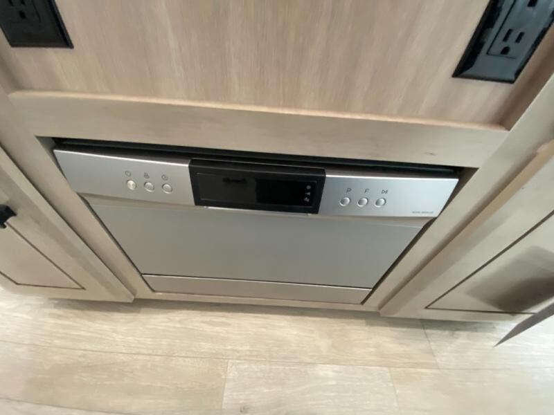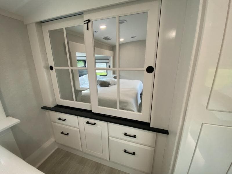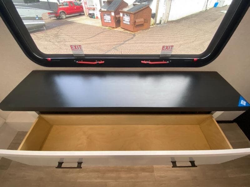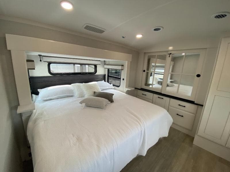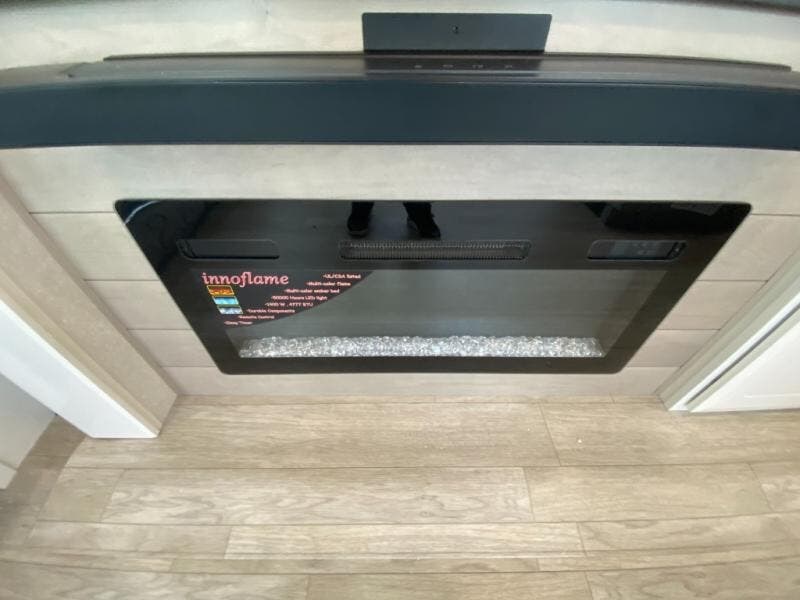 Trips to the lake are made comfortable in this triple slide out fifth wheel. Once you arrive at the campground, set up the two power awnings with LED lights, and there is an exterior TV for the big game. Head inside to relax on the theater seats directly across from the TV and fireplace, or play a game at the roll-top dinette. The chef of your group will love this kitchen with its residential refrigerator, kitchen island, and pantry, plus additional storage for canned goods or paper products. The full bath will allow you to stay clean throughout your trip, and you'll find a residential style backsplash in the bath, plus a walk-in shower. Nothing says luxury like your own king bed slide out in the front bedroom, a large front closet with hamper and drawers for wrinkle-free clothes, and a flip-up dresser featuring a 32" TV!