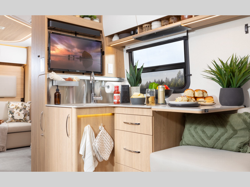 Each Unity Class B+ diesel motorhome by Leisure Travel sits on a durable Mercedes-Benz Sprinter 3500 dual rear wheel chassis with a 2.0-L Turbocharged I-4 diesel engine to power your adventures. The powder coated steel undercarriage support structure and vacuum-bonded construction provide a coach that will last for years, and there are eight sleek exterior paint options to make the coach your own. You'll love driving the Unity with its electronic stability control, adaptive cruise control, 9-speed automatic transmission with quieter noise levels and more comfort. There is even a digital mirror with sharp high-resolution that can be switched between convectional display and digital display for convenience. The luxurious interior includes Ultraleather furniture, a contoured solid surface Corian countertop in the kitchen, new decor options, plus many more comforts. And all of your power need will be met with 270-Ah, 12V Lithium coach batteries with an internal heating system, plus a 3000W pure sine inverter and a 30 Amp power cord. If you choose the optional 60th Anniversary Edition, you will enjoy the Diamond White exterior paint, diamond-quilted upholstery, Cool Ice Ultrafabrics, matte black hardware, and more elegant features that are exclusive to this package!