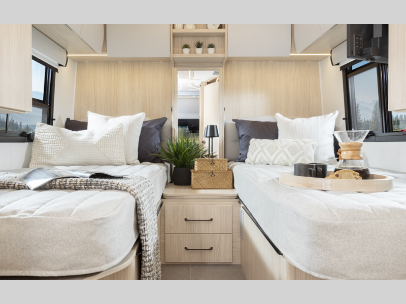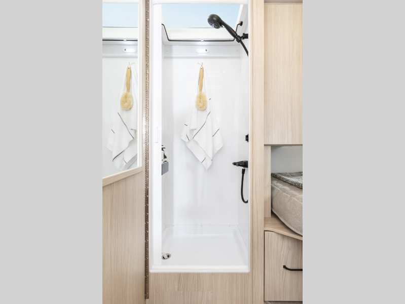 Comfortable and versatile features allow you to travel the way you like in this Unity Class B+ diesel motorhome. You have plenty of choices on how you want to sleep and how you would like to dine. Each night, you can sleep separately from your spouse on one of the two twin-size beds or convert the twins into one king-size bed for more space together. Even the bathroom area is multi-functional because of its separate lavatory from the enclosed shower, and the adjustable front seating area is handy for dining, sleeping, or playing a card game with the family. The flush-mount LP cooktop makes it easy to make your delicious meals, and if you have any leftovers, then you can store them inside the 12V compressor refrigerator with a bottom freezer drawer.