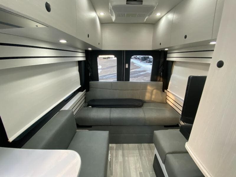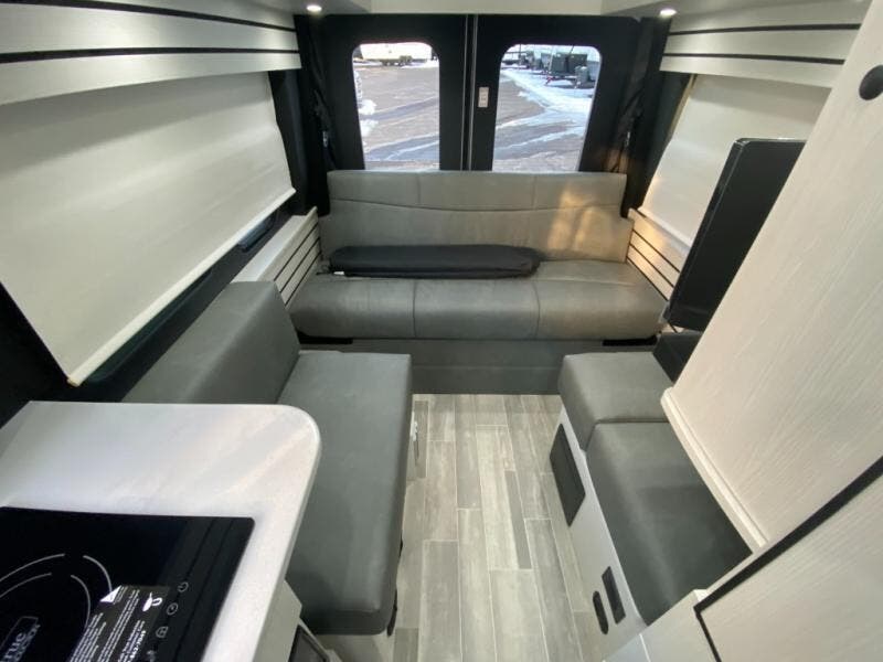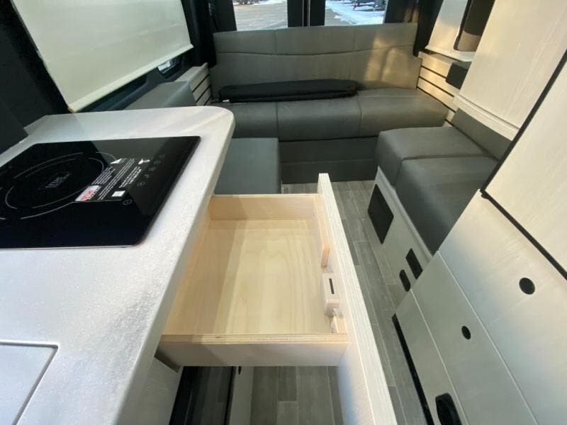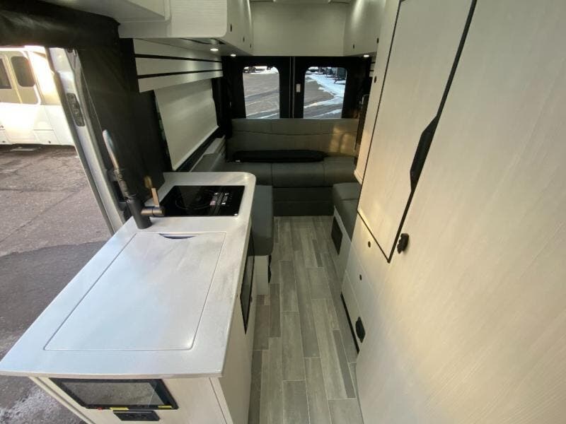 Plan to see the country in this Class B gas motorhome that includes everything you need while away from home. The power sofa with memory foam cushions will provide a great night's rest after traveling all day and the convenient wet bath with a handheld shower will allow you to clean up each morning. Prepare breakfast on the one burner induction stove top and you'll also find a microwave oven for quick meals. Food for the week can go in the 12V 3.2 cu. ft refrigerator/freezer and the overhead compartments can hold all the snacks. This model also includes a Lagun table mount system with 360-degree swivel top so you can enjoy coffee with your loved one.