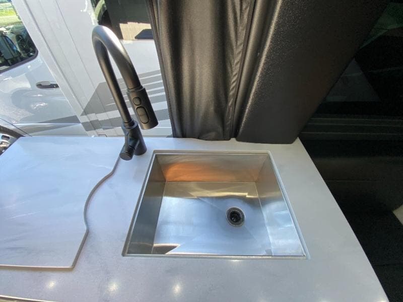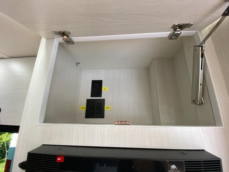 This Plateau Class B diesel motorhome features 74" x 30" twin beds, making it easier than ever to travel with a friend! There is also an array of storage options between the overhead cabinets, the soft-close drawers, and the pull-out pantry. If you have to get a little bit of work done while on the road, then you will love the front lounge flip-up workstation with a 120V power outlet, USB charging ports, and a privacy shade as well. The microwave makes it easy for you to pop a bag of popcorn and watch a movie on the front or rear 24" smart LED TV!