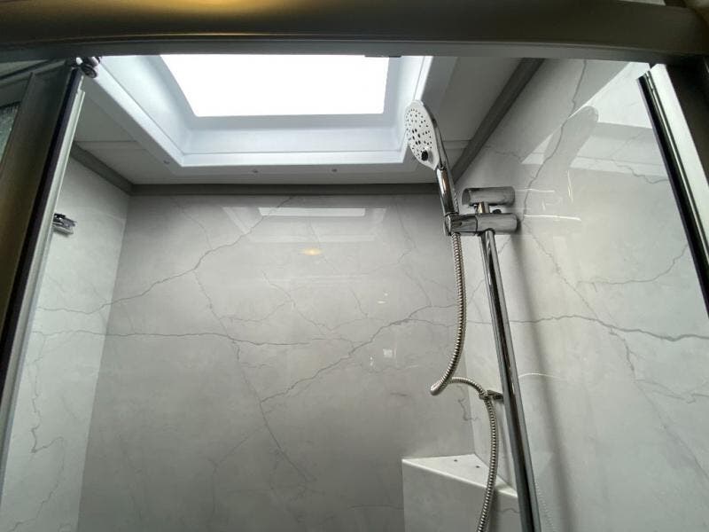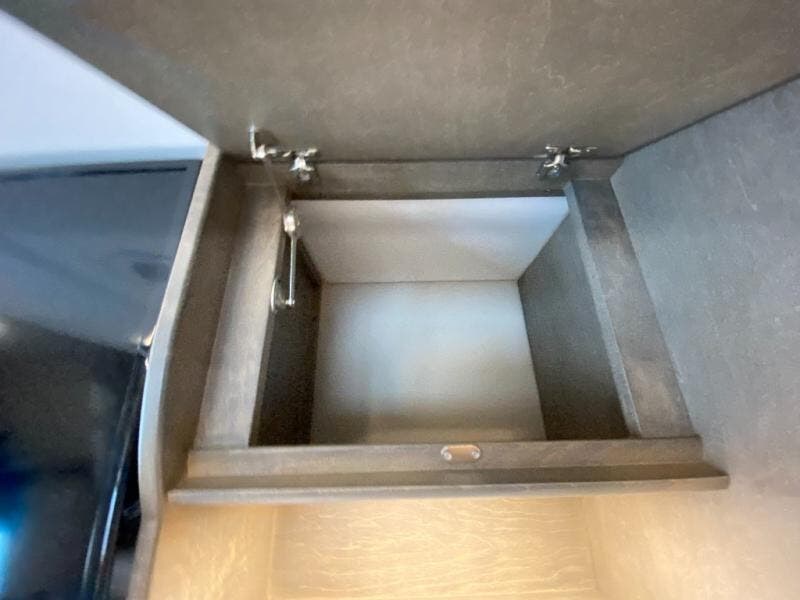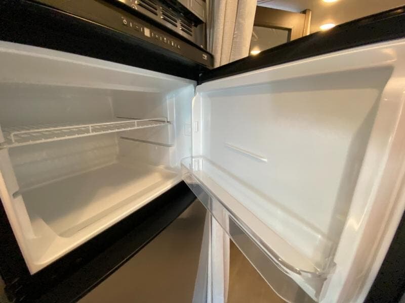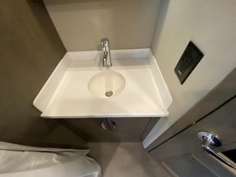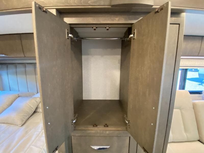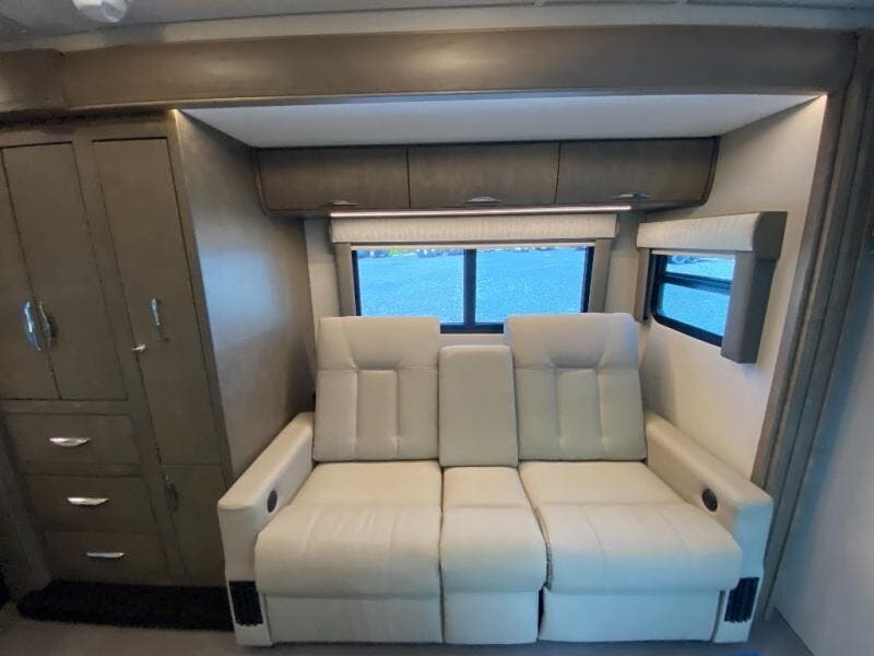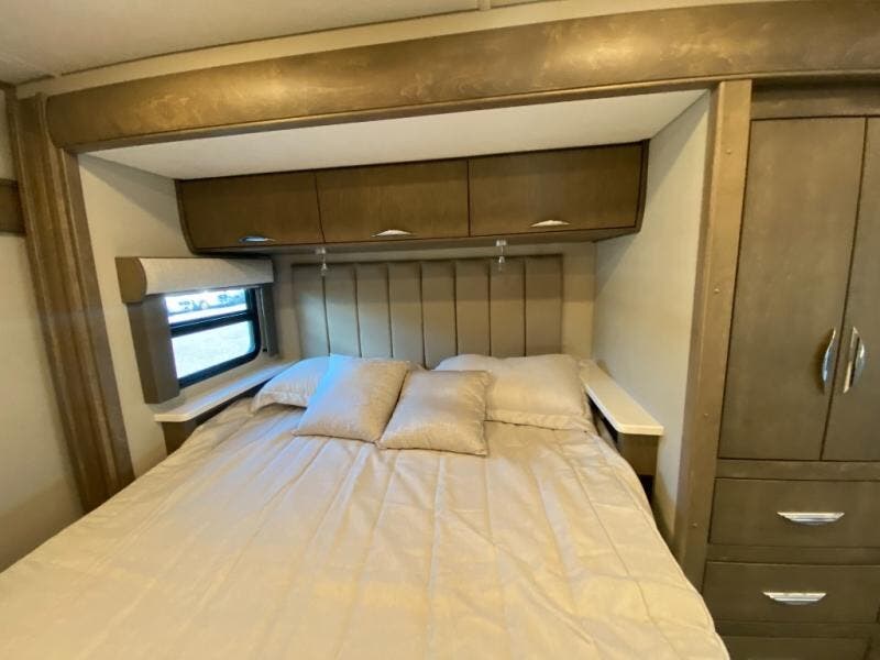 You will have a luxurious experience traveling in this motorhome! After a long day of traveling, you can either take a hot shower in the rear corner private bath, or lay down on the queen bed within the large slide. The bathroom sink is just outside the door with a medicine cabinet to store your toiletries. There is plenty of storage throughout between the wardrobe, the overhead cabinets, and the pantry, as well as outside with side swing baggage doors. The dinette is a great place to enjoy meals, play games, and transform into a sleeping space, and with a 46" x 80" bunk mattress above the cab, another person can join in on the fun!