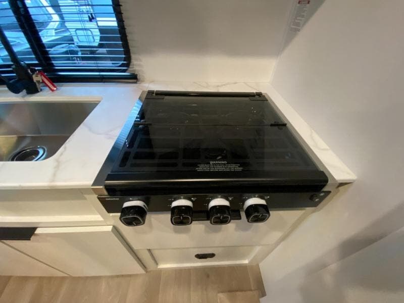 You'll love every minute spent in this spacious travel trailer! With dual entry doors, you can enter in through the rear kitchen or the front private bedroom! There are dual beside wardrobes here and a closet so you can keep your space organized, and the full bath is right next to the bedroom for easy nighttime use. Back to the kitchen, you'll find ample counter space to prep meals, a three-burner cooktop, plus a pantry and 10 cu. ft. 12V refrigerator for food storage. Your crew can dine at the booth dinette, then relax on the theater seating slide out after dinner or head outdoors to enjoy the 16' power awning with LED lights!