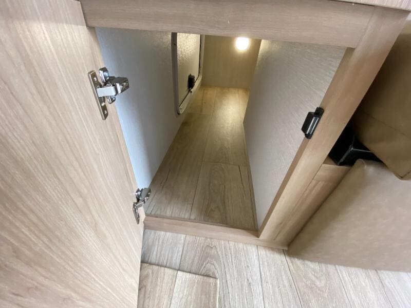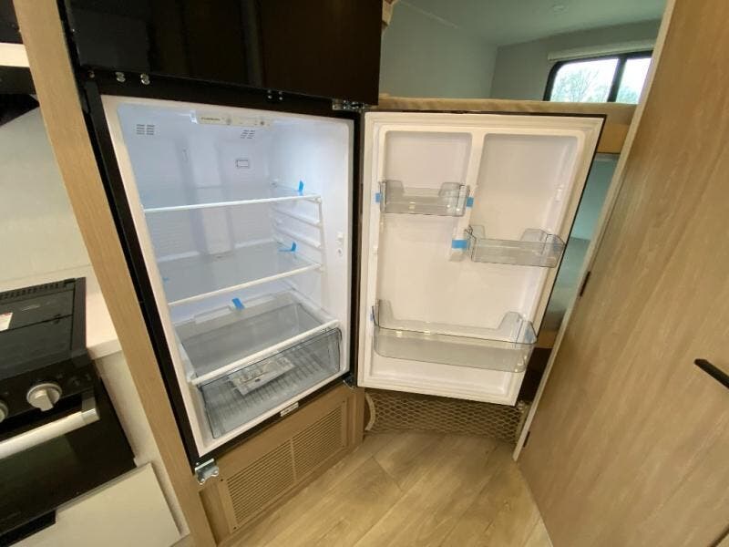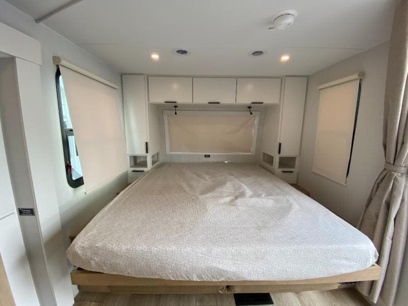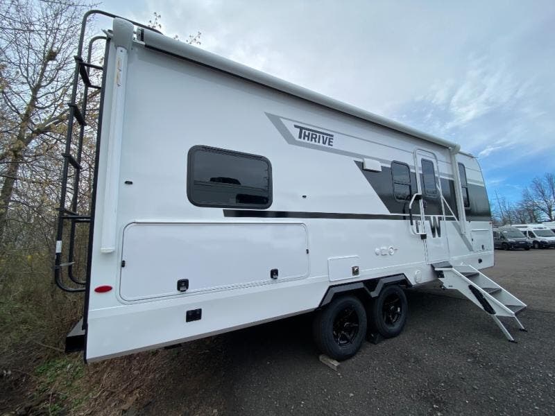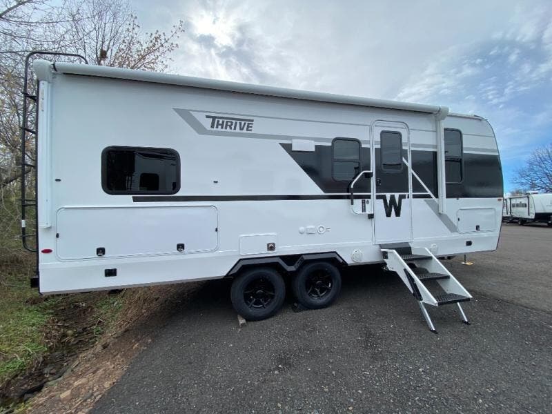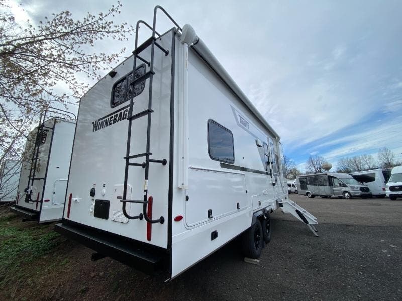 With any Thrive travel trailer by Winnebago, you can camp with functionality, comfort, and convenience! The large front viewing window with strike guard will be the first thing that catches your eye, and the fiberglass sidewalls with Azdel Onboard provide a durable trailer made to last. There is also an exterior ladder, along with front radius profile lights, power stabilizer jacks, and a powered awning with LED lighting to name a few exterior features. You will stay powered up by the 30-amp power cord and 200-watt solar panel, plus there is a tankless water heater for endless hot showers. Inside, you'll love the custom Winnebago furniture, carpetless side outs, molded fiberglass countertops, and residential recessed ceiling lights to keep your space well lit!