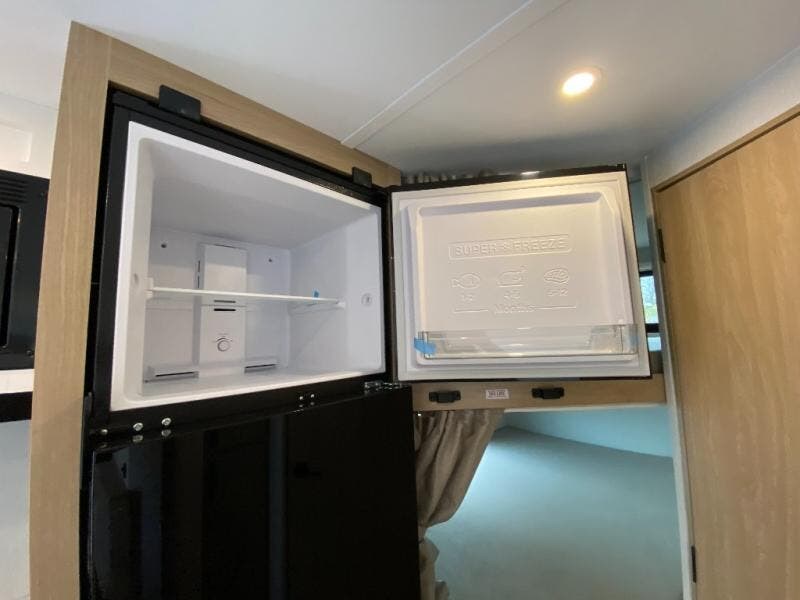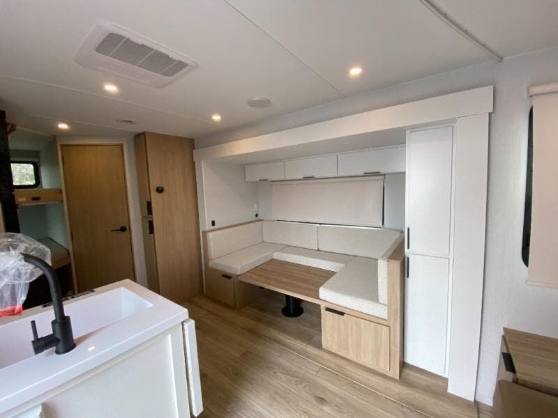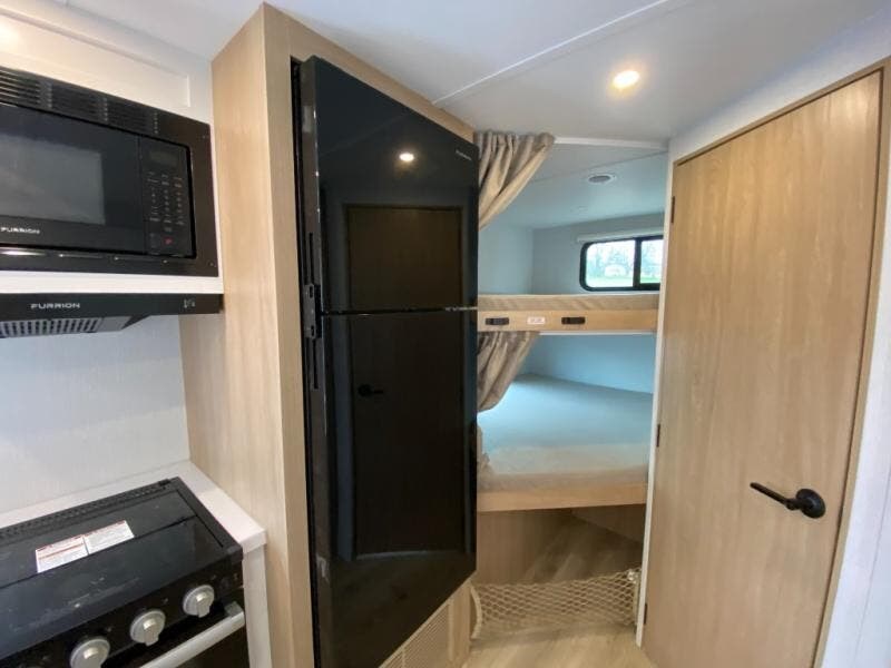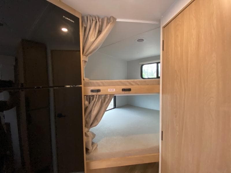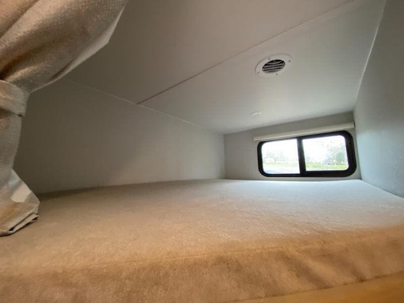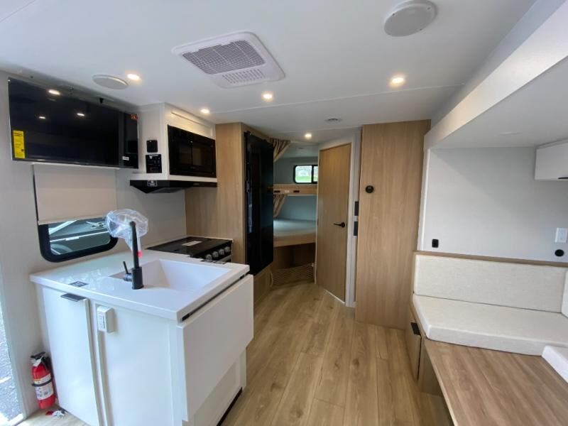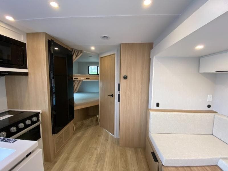 If you enjoy camping with a larger group, this travel trailer with double-size bunks is sure to be a fit! There is also a U-shaped dinette within a slide for more sleeping space, and you'll find the front Olympic Queen Murphy bed to be very versatile. A recessed three burner cooktop with an oven will let you make meals each day, and the 10.6 cu. ft. 12V refrigerator will keep your cold items fresh. There is also a countertop extension, giving you more space to prep meals. The full bath includes a power vent fan and a shower skylight that will give you additional lighting and extra head room as you get ready each day!