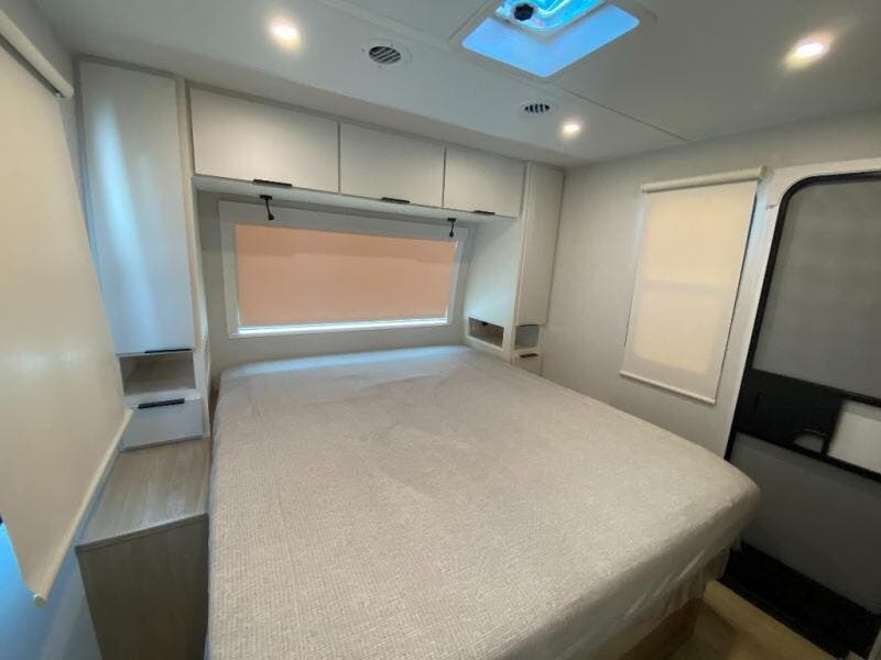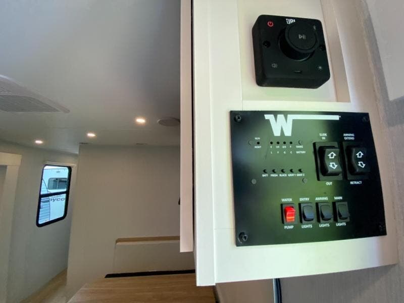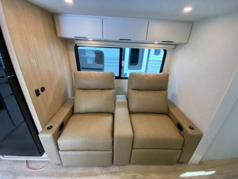 With any Thrive travel trailer by Winnebago, you can camp with functionality, comfort, and convenience! The large front viewing window with strike guard will be the first thing that catches your eye, and the fiberglass sidewalls with Azdel Onboard provide a durable trailer made to last. There is also an exterior ladder, along with front radius profile lights, power stabilizer jacks, and a powered awning with LED lighting to name a few exterior features. You will stay powered up by the 30-amp power cord and 200-watt solar panel, plus there is a tankless water heater for endless hot showers. Inside, you'll love the custom Winnebago furniture, carpetless side outs, molded fiberglass countertops, and residential recessed ceiling lights to keep your space well lit!