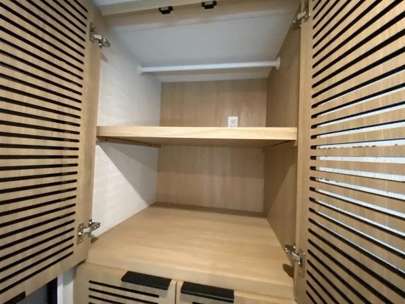 This travel trailer provides both comfort and convenience. At the front, you'll find a private bedroom with its own exterior entry for added privacy and ease of access. The middle bathroom ensures convenient access from all areas and includes a wardrobe with washer and dryer prep. In the main living space, a spacious 42" x 82" Mega Dinette provides a great spot for meals, games, or work, while theater seating across from the TV allows for relaxing evenings. At the rear, the fully equipped kitchen includes a cooktop with oven, a refrigerator, and a pantry with pull-out shelves for maximum storage and organization. A second exterior exit from the kitchen area adds extra convenience, providing both a comfortable and functional trailer.