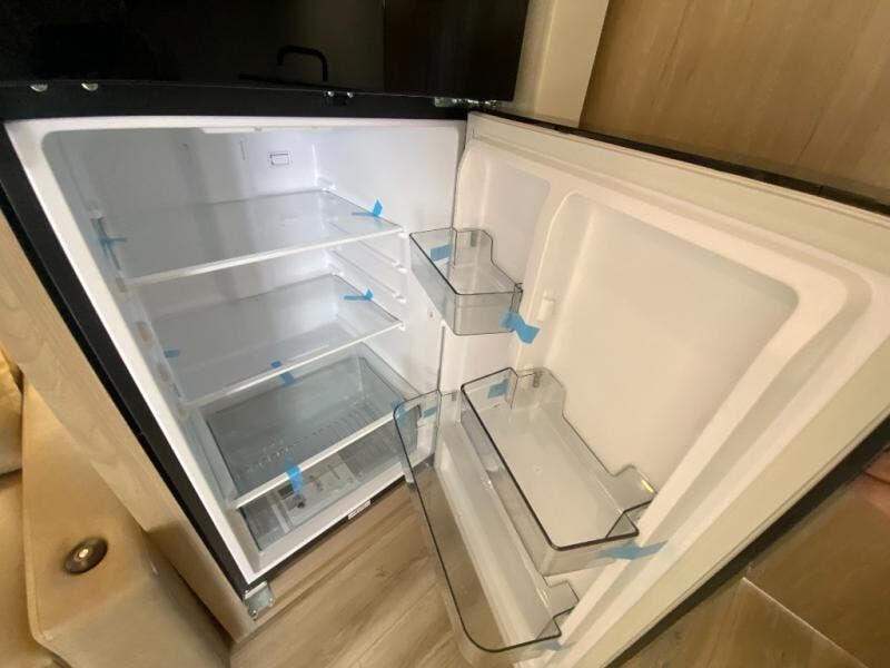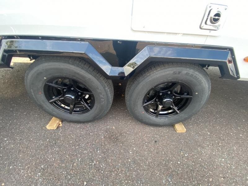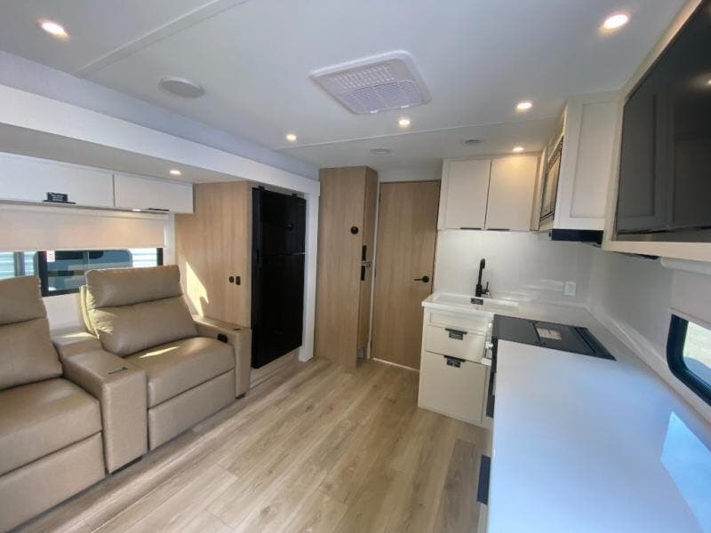 The rear living space of this travel trailer offers a spacious and welcoming layout, perfect for relaxing or entertaining after a day of adventure. In the main area three is a large 42" x 86" U-shaped dinette, with plenty of room for meals, games or gathering to share stories. Beside there is theater seating located in the slide-out that adds extra comfort and seating space. Across, a cozy fireplace and TV making this the ideal spot for winding down in the evenings. The kitchen and appliances allow the chef to easily move around in the spacious living area. Moving forward, a pass-through bathroom adds convenience and privacy, leading to the front private bedroom. Here you'll find a spacious 66" x 80" Olympic Queen Bed, on each side wardrobes for ample storage. The bedroom also features a second exterior entry door, providing easy access without disturbing the main living area.