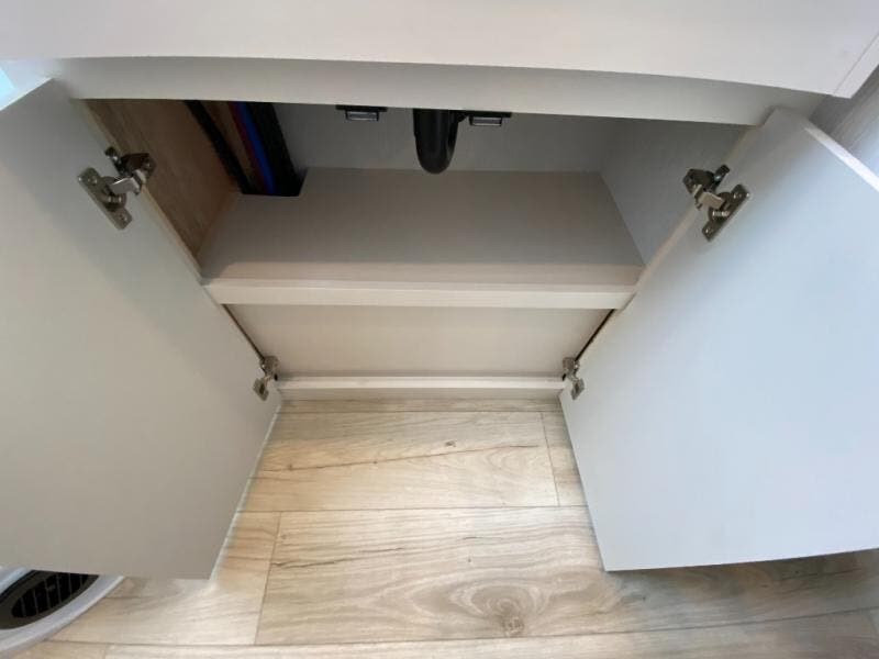 Private Rear Bedroom – Queen bed, wardrobe storage, and pocket door privacy make it perfect for extended trips or full-time RVing.